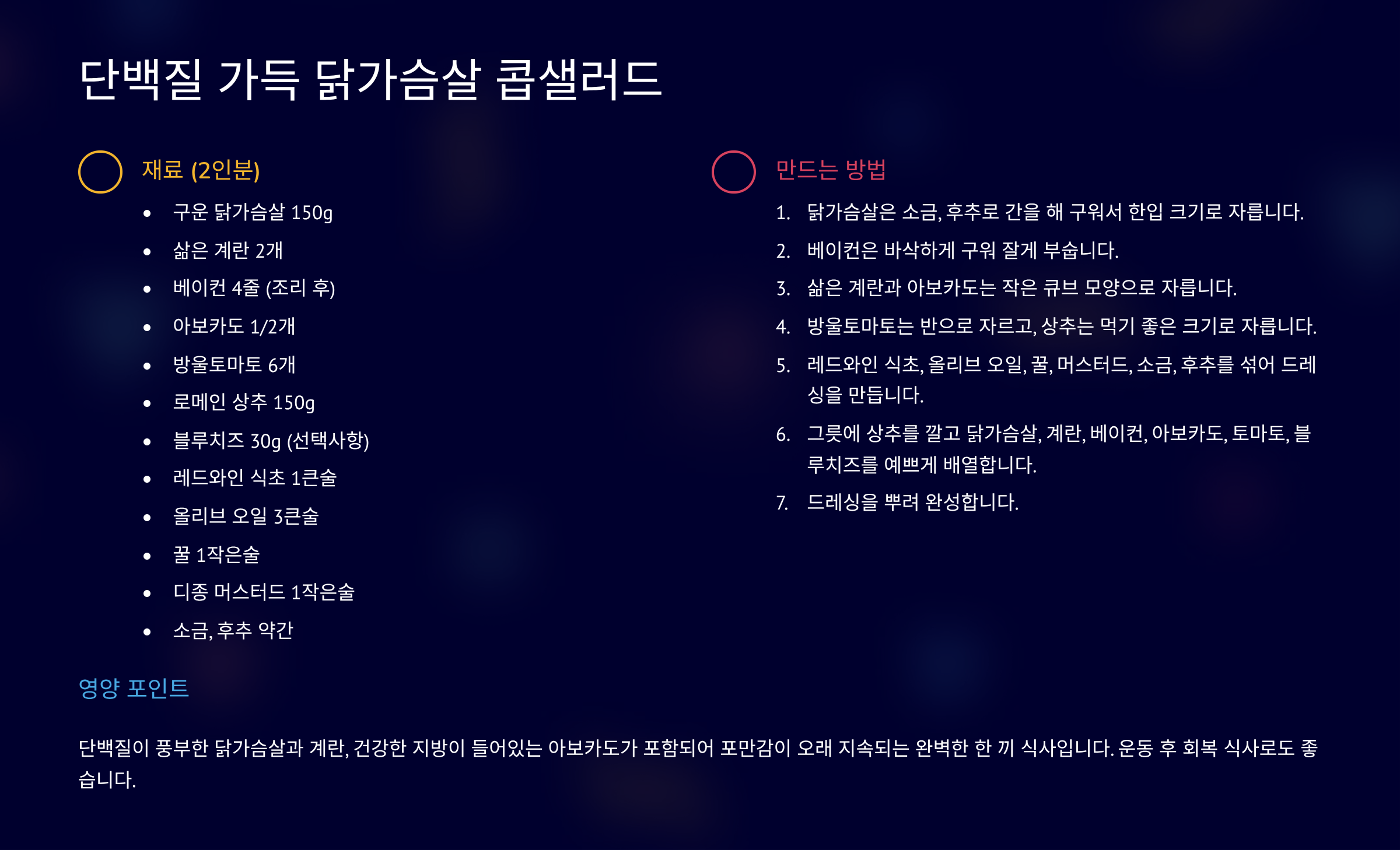 콥샐러드는 다양한 재료를 촘촘하게 배열하여 시각적인 즐거움과 함께 풍성한 맛을 선사하는 샐러드입니다. 닭가슴살은 고단백 저지방 식품으로 다이어터들의 필수품이며, 삶은 계란, 베이컨, 옥수수, 토마토 등 다양한 재료를 한 번에 섭취할 수 있어 균형 잡힌 영양을 제공합니다. 특히 베이컨은 에어프라이어에 바삭하게 구워 기름기를 제거하면 더욱 건강하게 즐길 수 있습니다. 이 샐러드는 한 접시만으로도 완벽한 한 끼 식사가 되므로, 바쁜 아침이나 점심에 준비하기 좋습니다.