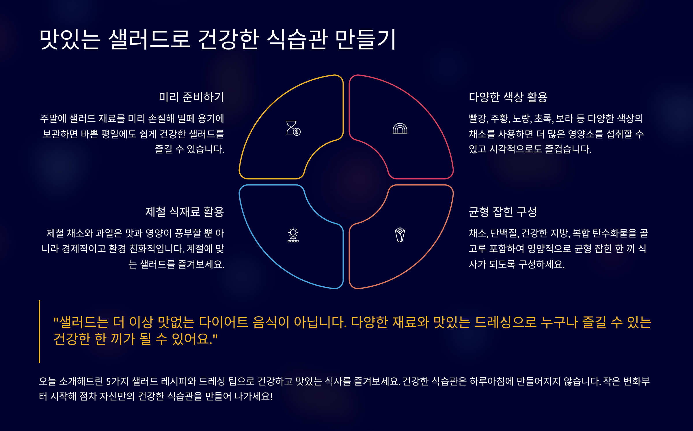 내가 생각했을 때, 샐러드의 가장 큰 장점은 무한한 변신이 가능하다는 것입니다. 어떤 재료를 넣고 어떤 드레싱을 뿌리느냐에 따라 맛과 영양이 완전히 달라지기 때문입니다. 닭가슴살, 연어, 렌틸콩 등 단백질 재료를 추가하면 포만감을 높일 수 있고, 과일이나 견과류를 넣으면 맛과 영양을 동시에 잡을 수 있습니다. 이제 지루했던 샐러드에서 벗어나, 나만의 특별한 샐러드 레시피를 만들어보는 것은 어떨까요? 건강한 식습관은 작고 맛있는 한 끼로부터 시작됩니다.