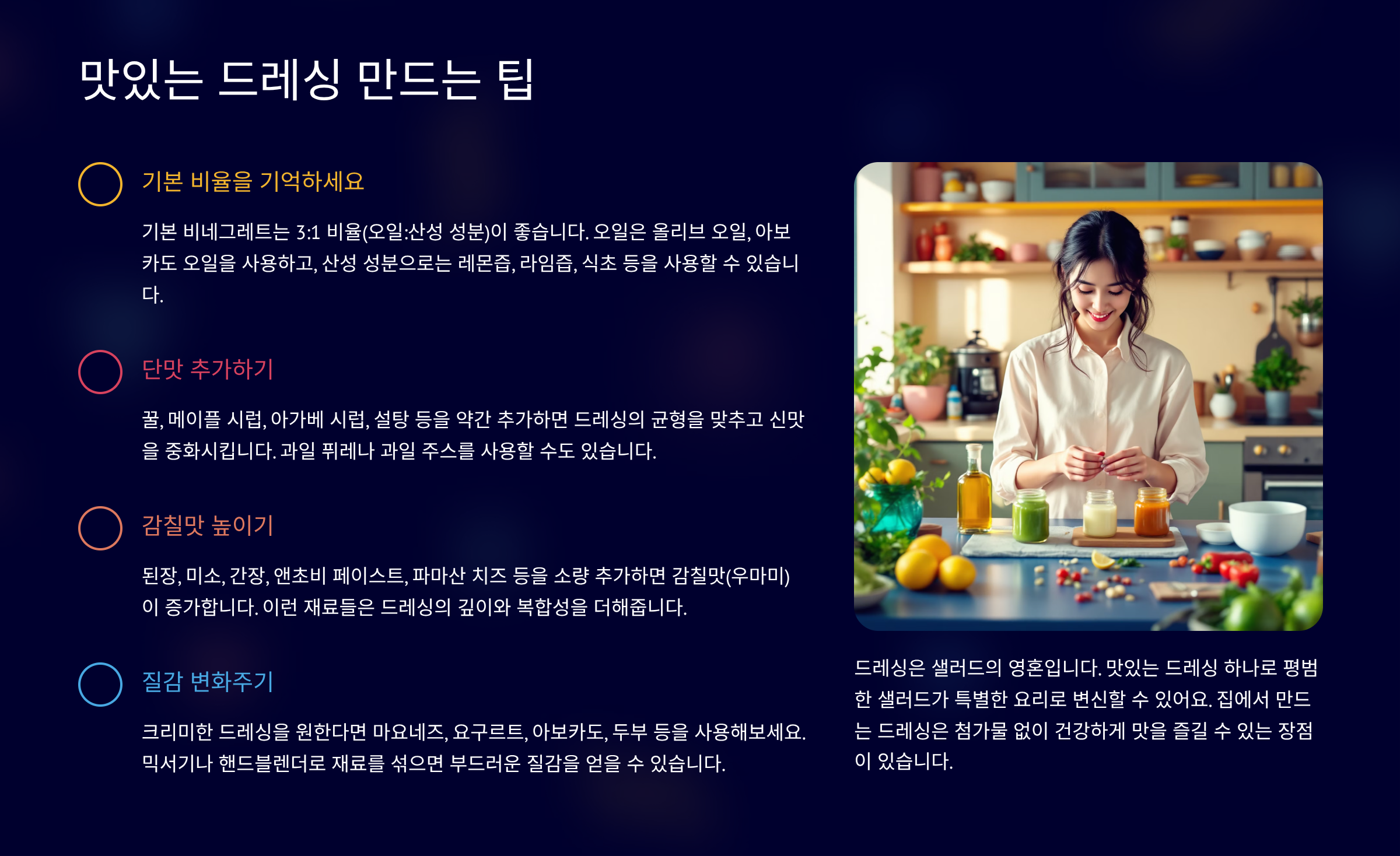 재료 구경하기드레싱을 만들 때, 다진 마늘이나 허브를 추가하면 풍미가 훨씬 좋아집니다. 특히 올리브오일 대신 아보카도 오일이나 들기름을 사용하면 영양을 더할 수 있습니다. 샐러드를 먹기 직전에 드레싱을 뿌려야 채소가 눅눅해지지 않고 신선한 식감을 유지할 수 있습니다. 드레싱을 미리 많이 만들어 냉장 보관해두면 필요할 때마다 간편하게 사용할 수 있어 편리합니다.