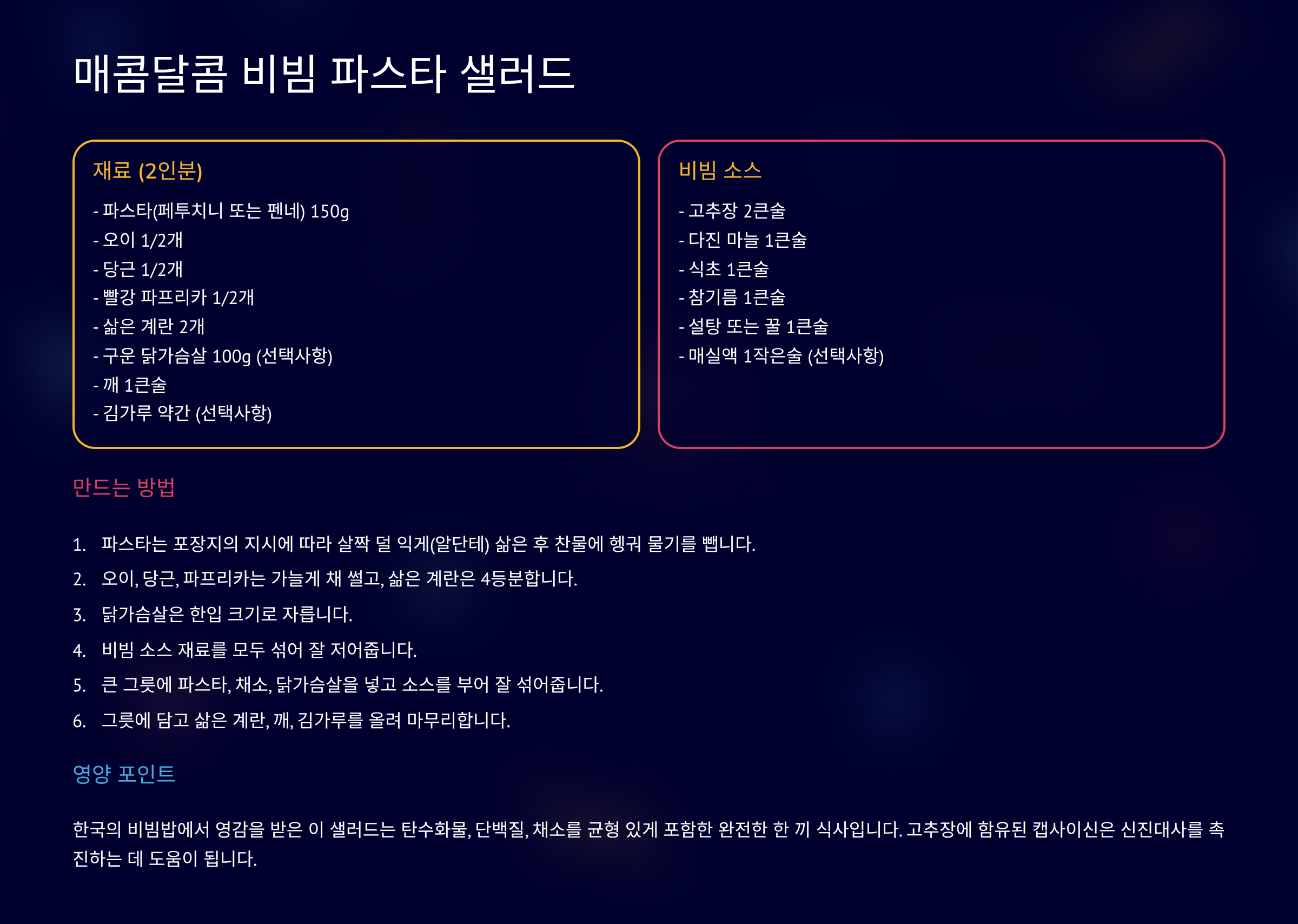샐러드만으로는 부족한 분들을 위해, 면과 채소를 함께 즐길 수 있는 비빔 파스타 샐러드를 소개합니다. 일반 파스타면 대신 통밀 파스타면을 사용하면 식이섬유를 더 많이 섭취할 수 있고, 매콤달콤한 비빔 드레싱이 입맛을 돋워 지루할 틈이 없습니다. 삶은 닭가슴살이나 새우 등을 추가하면 단백질을 보충할 수 있어 더욱 완벽한 한 끼 식사가 됩니다. 특히 매콤한 맛을 좋아하지만 다이어트를 해야 한다면 이 레시피를 강력 추천합니다.