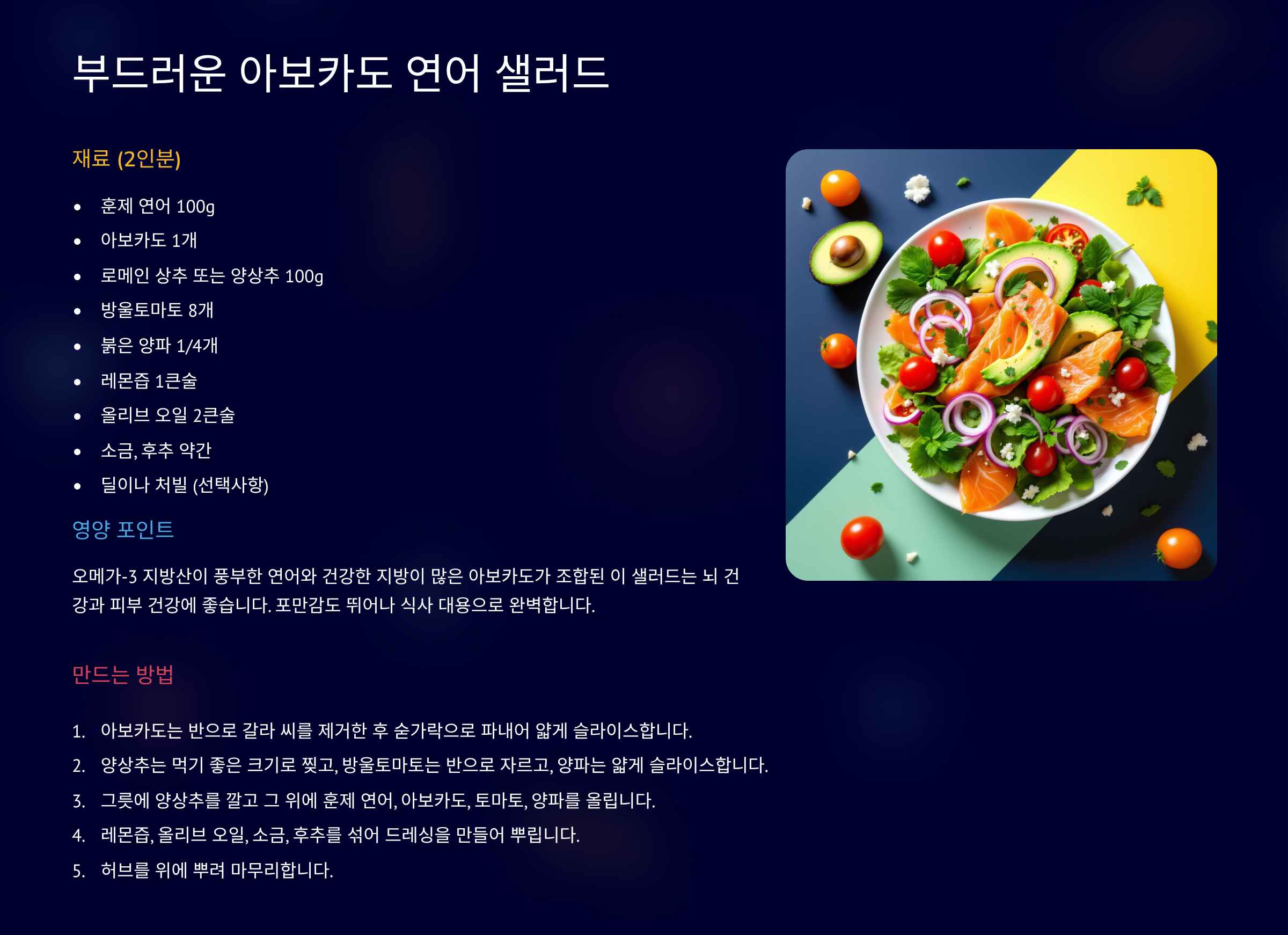 신선한 연어와 부드러운 아보카도의 조합은 맛과 건강을 모두 잡는 완벽한 선택입니다. 연어는 오메가-3 지방산이 풍부하여 심혈관 질환 예방에 도움을 주며, 뇌 건강에도 좋습니다. 아보카도는 불포화지방산과 비타민, 미네랄이 풍부하여 피부 미용과 노화 방지에 효과적입니다. 여기에 신선한 채소를 곁들이고, 상큼한 레몬즙 드레싱을 뿌리면 느끼함 없이 맛있게 즐길 수 있습니다. 이 샐러드는 특히 점심 식사로 활용하기 좋으며, 가볍지만 포만감이 있어 다이어트 식단으로도 손색이 없습니다.