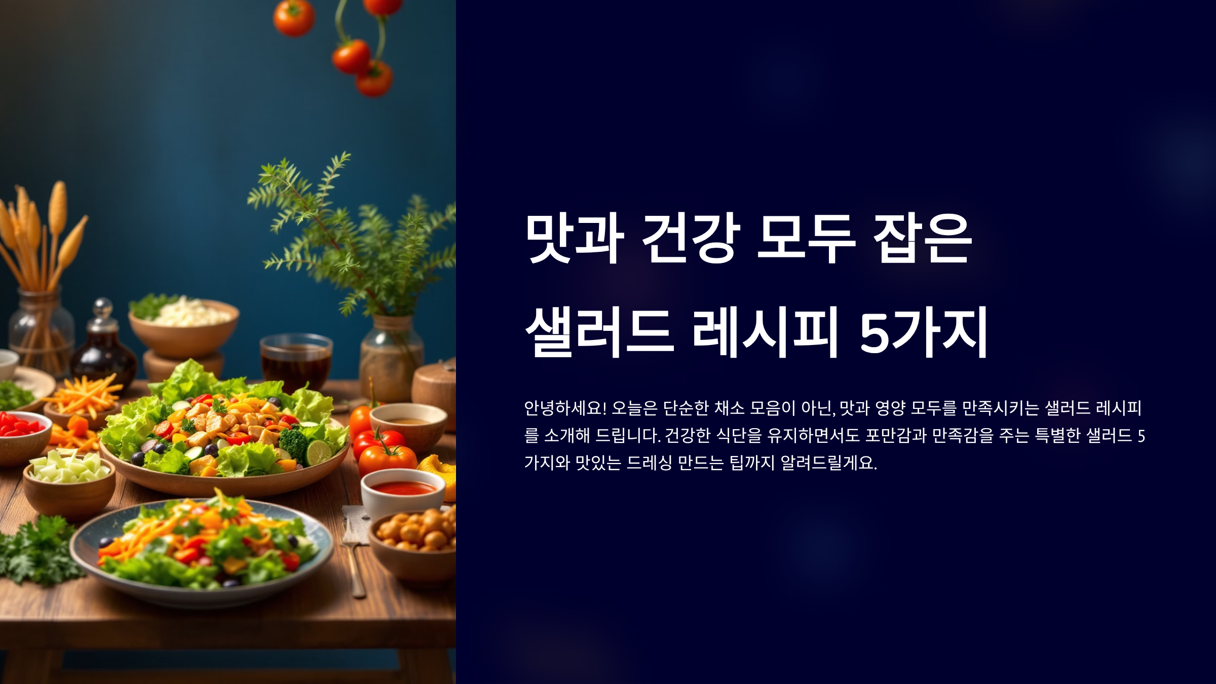 '샐러드' 하면 어떤 이미지가 떠오르시나요? 아마 많은 분들이 풀잎만 가득한 지루한 다이어트 식단을 떠올릴 것입니다. 하지만 샐러드는 신선한 채소와 다양한 식재료를 조합하여 영양은 물론, 맛까지 완벽하게 잡아내는 건강한 한 끼 식사가 될 수 있습니다. 특히 바쁜 현대인들에게는 간편하면서도 균형 잡힌 영양을 섭취할 수 있는 최고의 선택지입니다. 단순히 체중 감량을 위한 식단이 아니라, 활력 넘치는 하루를 위한 필수 영양소를 채워주는 중요한 역할을 합니다. 이 글에서는 샐러드를 더욱 맛있고 건강하게 즐길 수 있는 특별한 레시피들을 소개합니다.