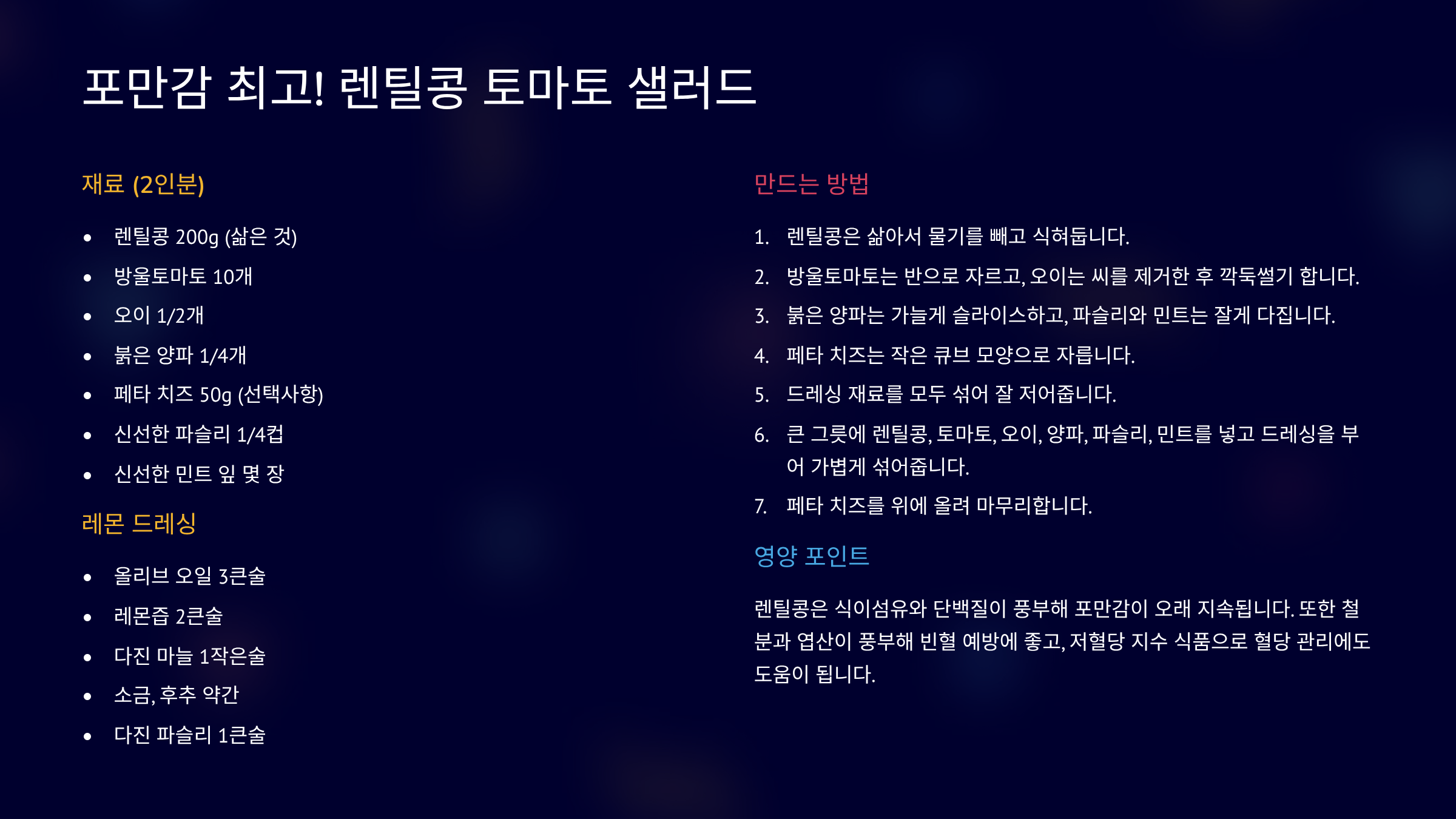렌틸콩은 '고기보다 좋은 곡물'이라고 불릴 만큼 단백질, 식이섬유, 철분 등이 풍부하여 다이어트와 건강 관리에 탁월한 식품입니다. 렌틸콩은 물에 불릴 필요 없이 삶아 바로 사용할 수 있어 조리법이 매우 간편합니다. 렌틸콩과 함께 방울토마토, 양파, 오이 등을 넣어 만들면 아삭한 식감과 상큼한 맛을 동시에 즐길 수 있습니다. 이 샐러드는 특히 포만감이 오래가므로, 과식하기 쉬운 저녁 식단으로 활용하기 좋습니다.