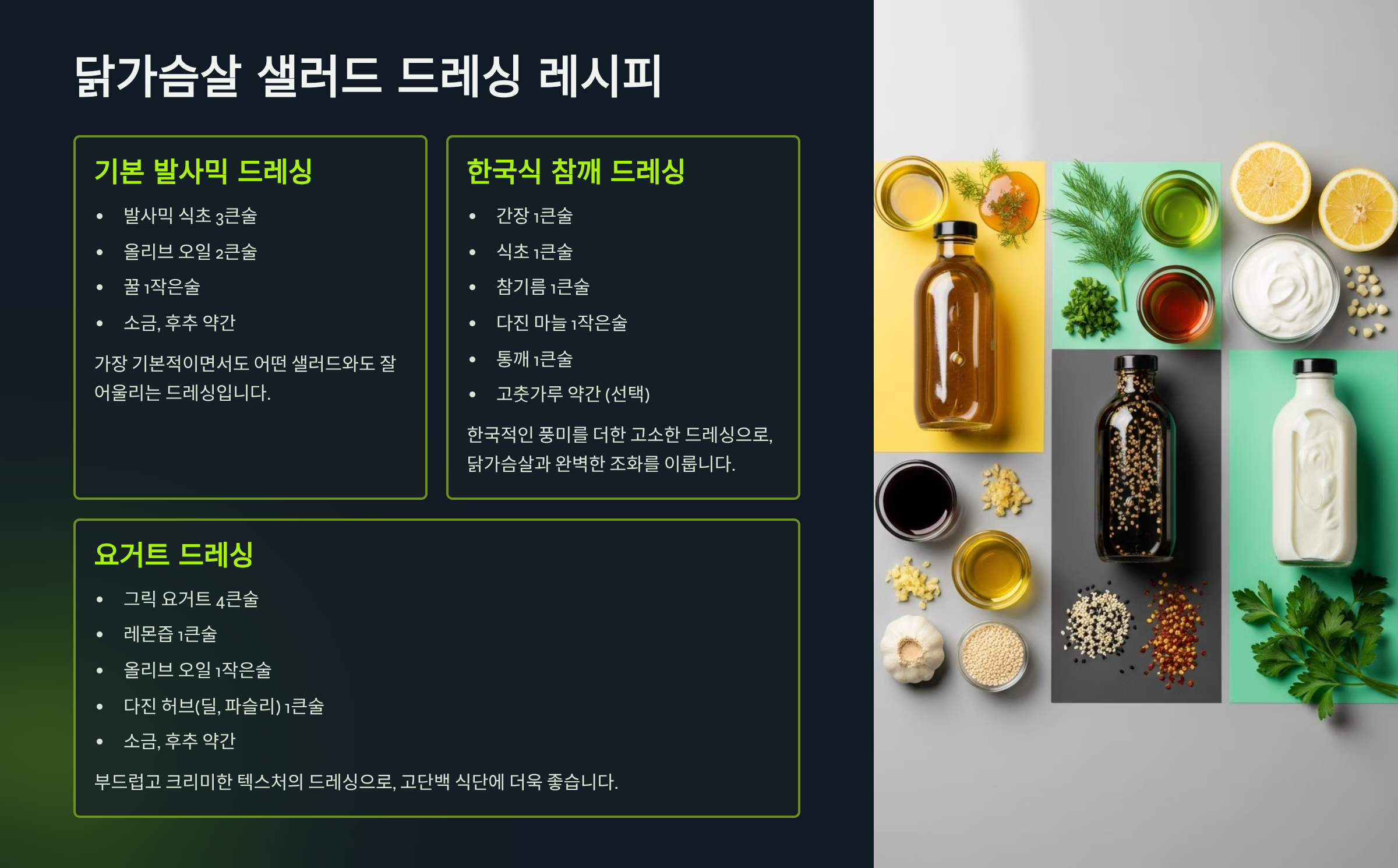 | 요거트 드레싱 | 그릭 요거트, 레몬즙 | 크리미하고 고소함 |