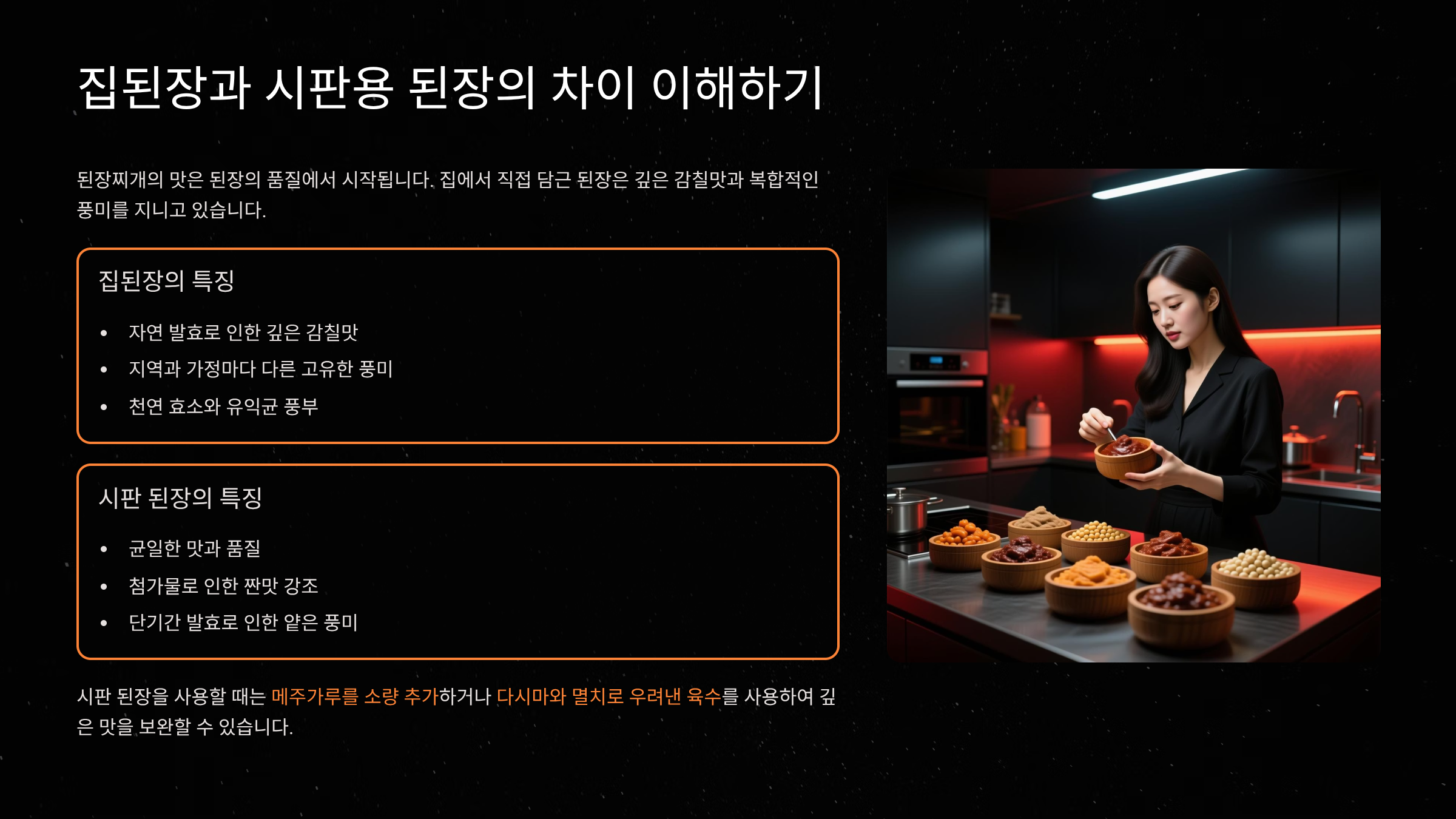 | 사용 시 팁 | 소량 사용하거나 다른 된장과 혼합 | 초보자도 쉽게 맛을 냄 |