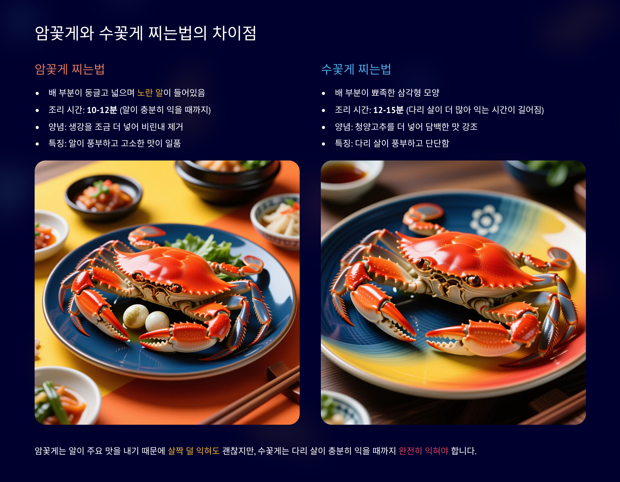 꽃게는 암수 구분에 따라 맛과 제철이 다르고, 찌는 방법에도 미묘한 차이가 있습니다. 먼저, 암꽃게는 배딱지가 넓고 둥근 모양이며, 수꽃게는 좁고 뾰족한 역삼각형 모양을 하고 있습니다. 암꽃게는 산란기인 봄(4~6월)에 주황빛 알이 가득 차올라 더욱 고소한 맛을 자랑하며, 수꽃게는 가을(9~11월)에 살이 꽉 차올라 담백하고 쫄깃한 식감이 일품입니다. 이처럼 제철이 다른 만큼 조리 시에도 약간의 차이를 두는 것이 좋습니다.