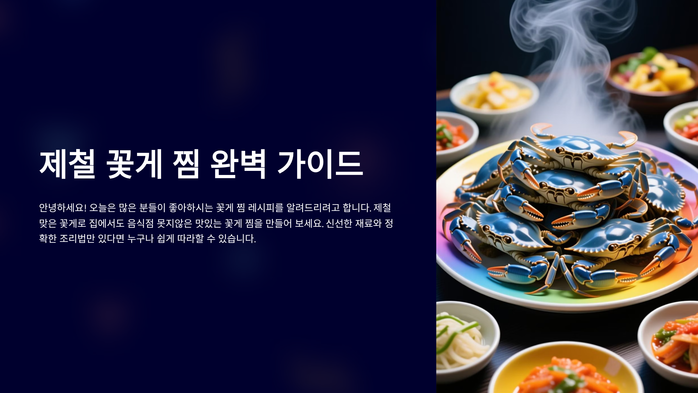 면책 조항: 본 글은 정보 제공 목적으로 작성되었으며, 제공된 모든 내용(레시피, 조리 시간, 보관법 등)은 일반적인 정보를 기반으로 한 추정치이며, 실제 내용과 다를 수 있습니다. 꽃게의 크기나 상태, 조리 환경에 따라 결과는 달라질 수 있습니다. 따라서 최종 조리 시에는 이용자 본인의 판단하에 진행해야 하며, 모든 책임은 이용자 본인에게 있습니다.