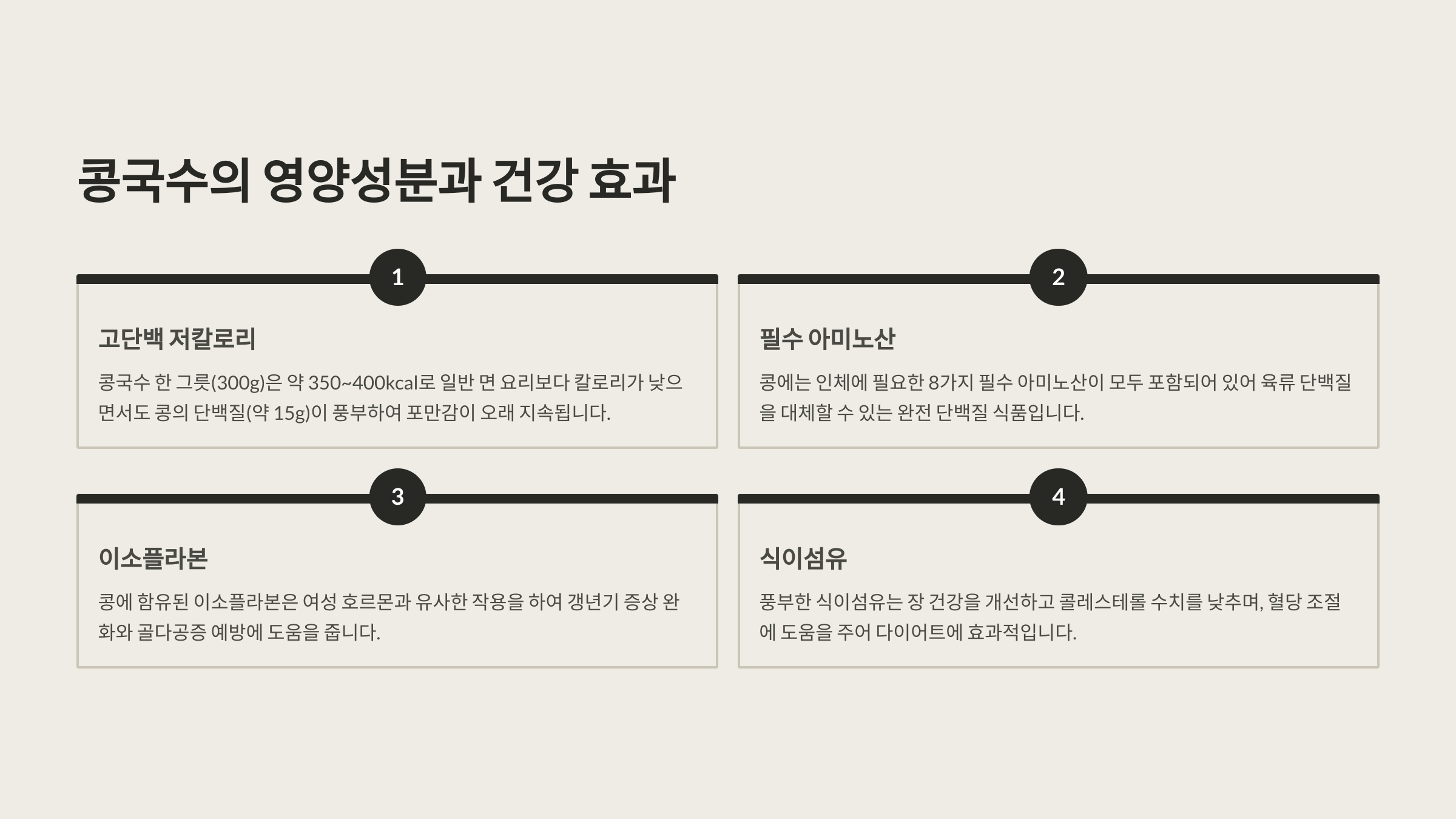 콩국수는 고소한 콩물에 면을 말아 먹는 간단한 요리지만, 영양은 꽤 풍부해요. 단백질과 식이섬유, 비타민, 미네랄이 가득해서 건강한 여름 식사로 손색없답니다. 이번 글에서는 저칼로리 콩국수 레시피와 함께 콩국수의 다양한 건강 효능까지 자세히 알려줄게요.
