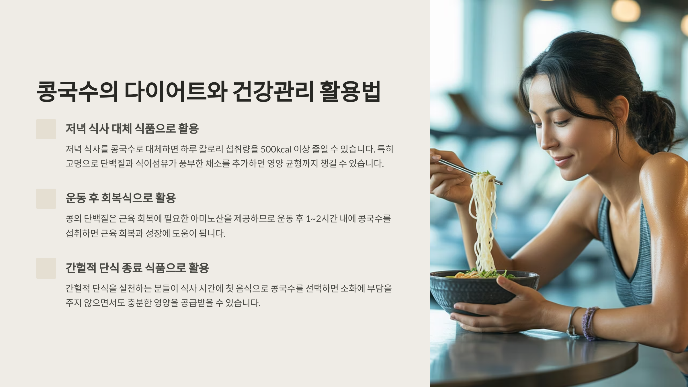 저칼로리 콩국수는 운동 후 회복 식사로도 훌륭해요. 단백질 공급과 수분 보충을 동시에 해줘서 운동 효과를 높이는 데도 도움이 된답니다. 다이어트 식단을 계획할 때 적극 추천하는 음식이에요.