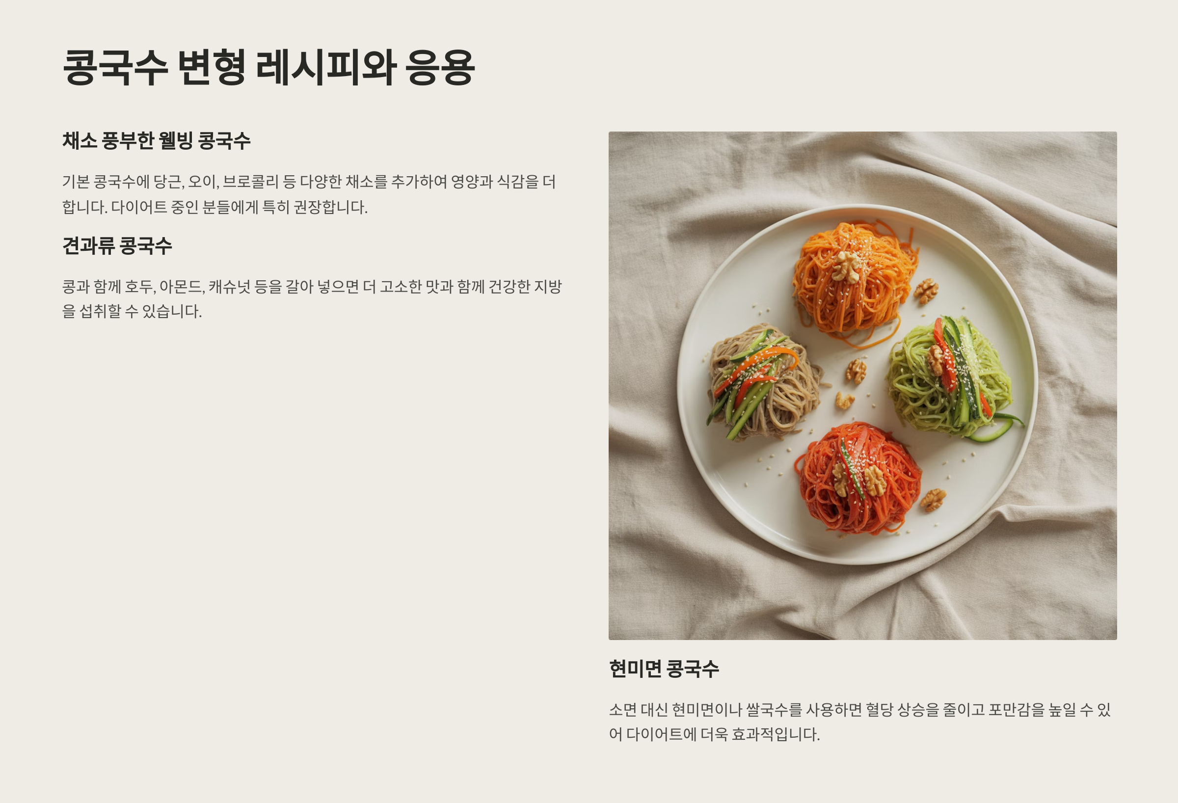 제가 생각했을 때, 콩국수는 이렇게 다양하게 변형할 수 있다는 점이 정말 매력적이에요. 각자의 취향에 맞게 재료를 바꾸거나 조리법을 바꿔 새로운 맛을 발견해보세요.