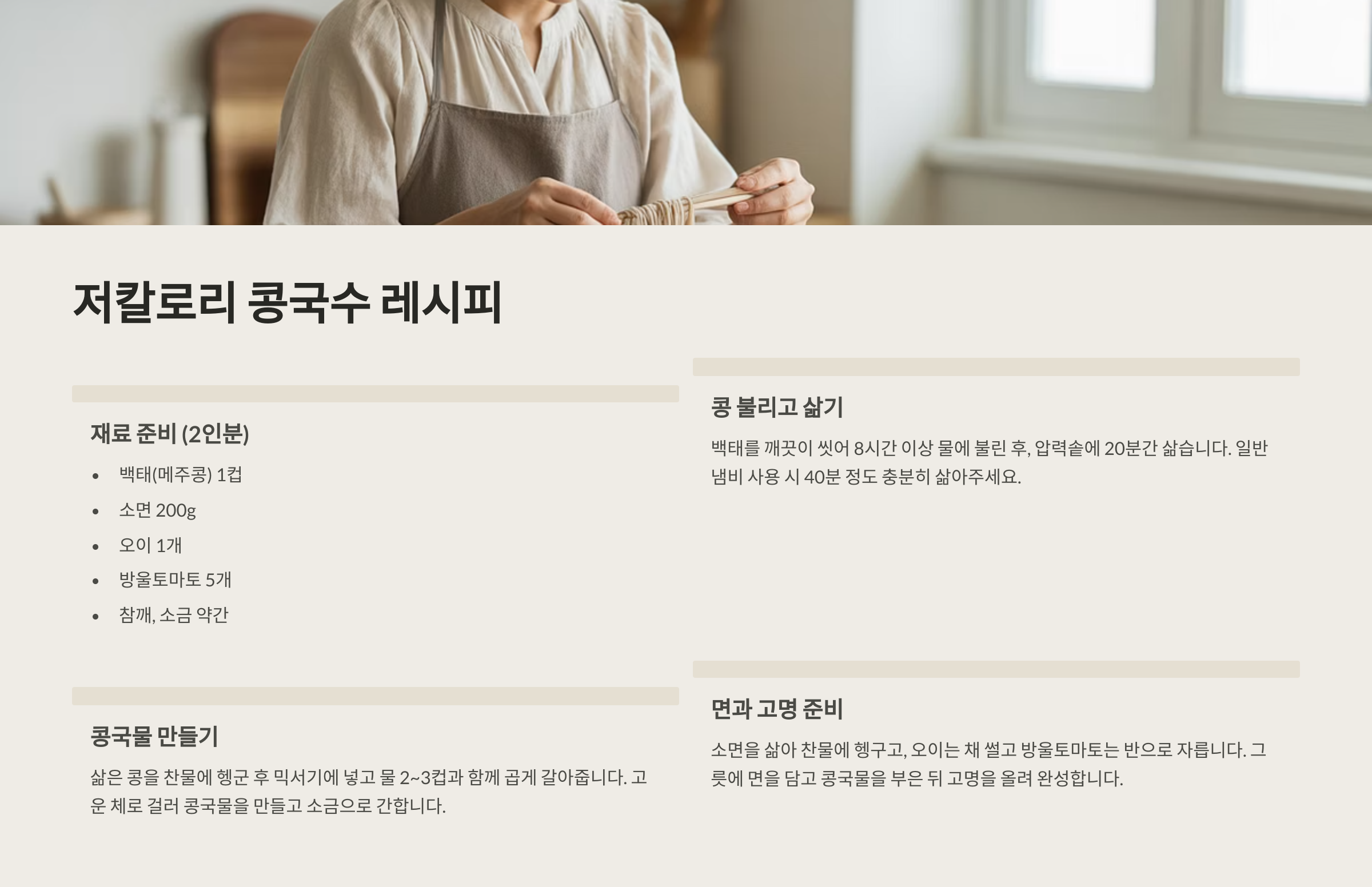 누구나 쉽게 따라 할 수 있는 단계별 레시피 가이드입니다. 각 단계를 따라오시면 고소하고 시원한 콩국수를 금방 완성할 수 있습니다.