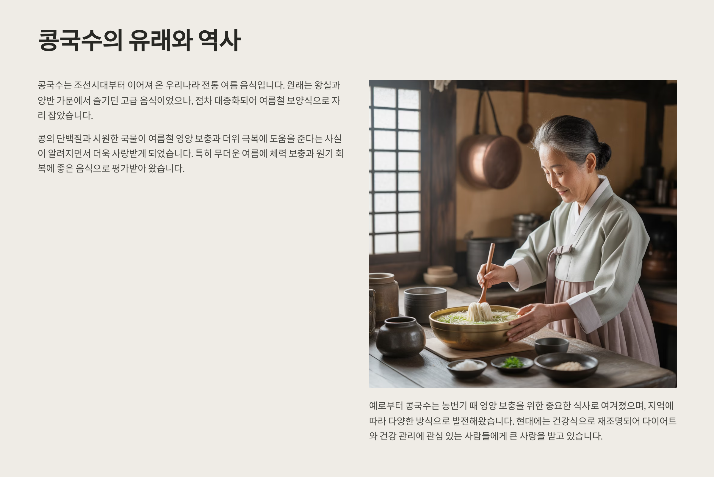 콩국수는 오랜 역사를 가진 한국의 전통 음식이에요. 옛날부터 여름철 더위를 식히기 위해 고소한 콩물을 면에 부어 시원하게 먹었답니다. 콩은 한국 농경사회에서 중요한 식재료였고, 이 콩으로 만든 콩국수는 단백질 보충원으로 인기가 많았어요.