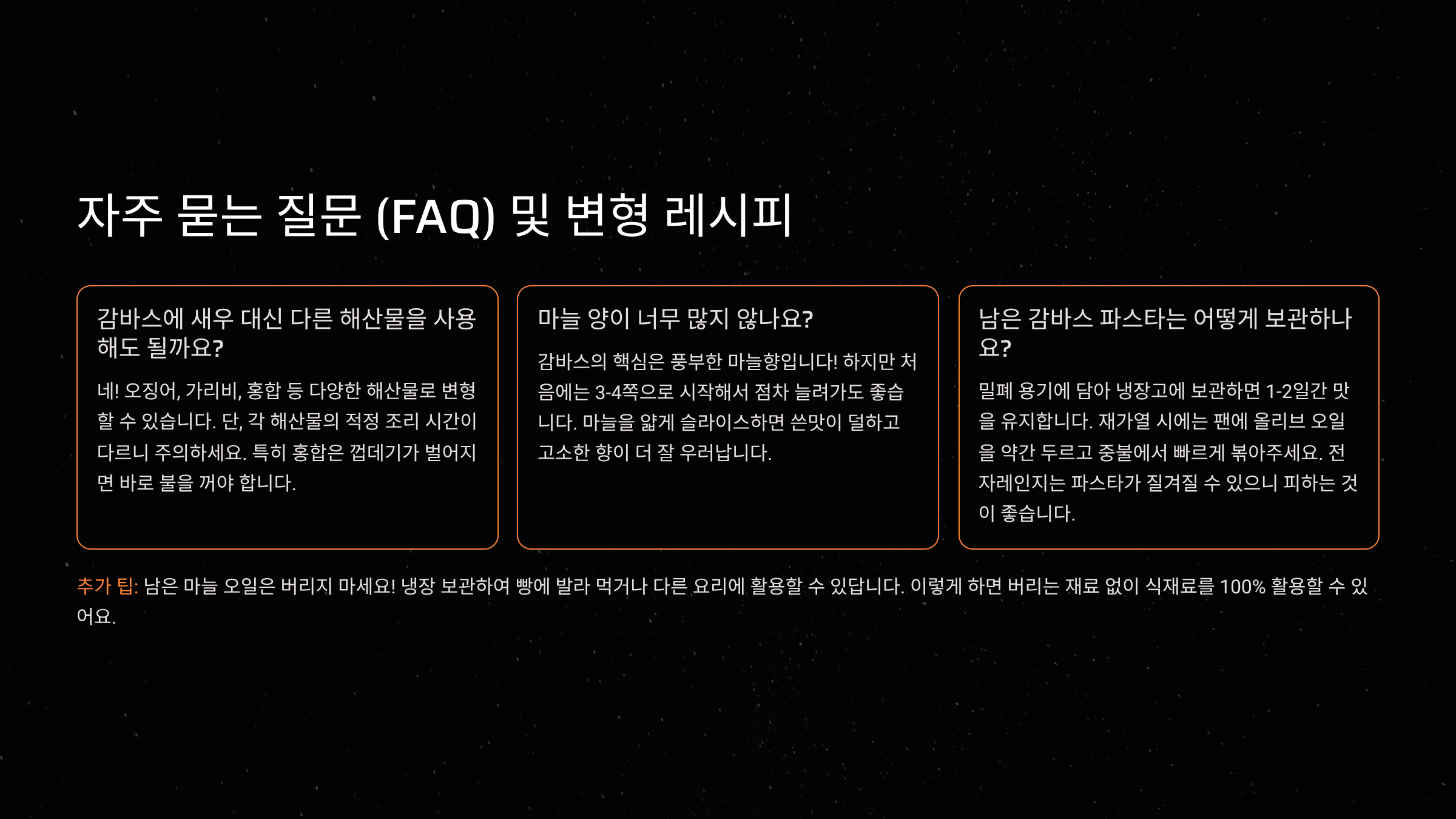 맛있는 새우 감바스 파스타 레시피를 통해 집에서도 레스토랑 못지않은 근사한 한 끼를 즐겨보세요! 누구나 쉽게 만들 수 있으니, 오늘 저녁 메뉴로 도전해보는 것은 어떨까요? 궁금한 점이 있다면 언제든지 댓글로 물어봐주세요! 🍝