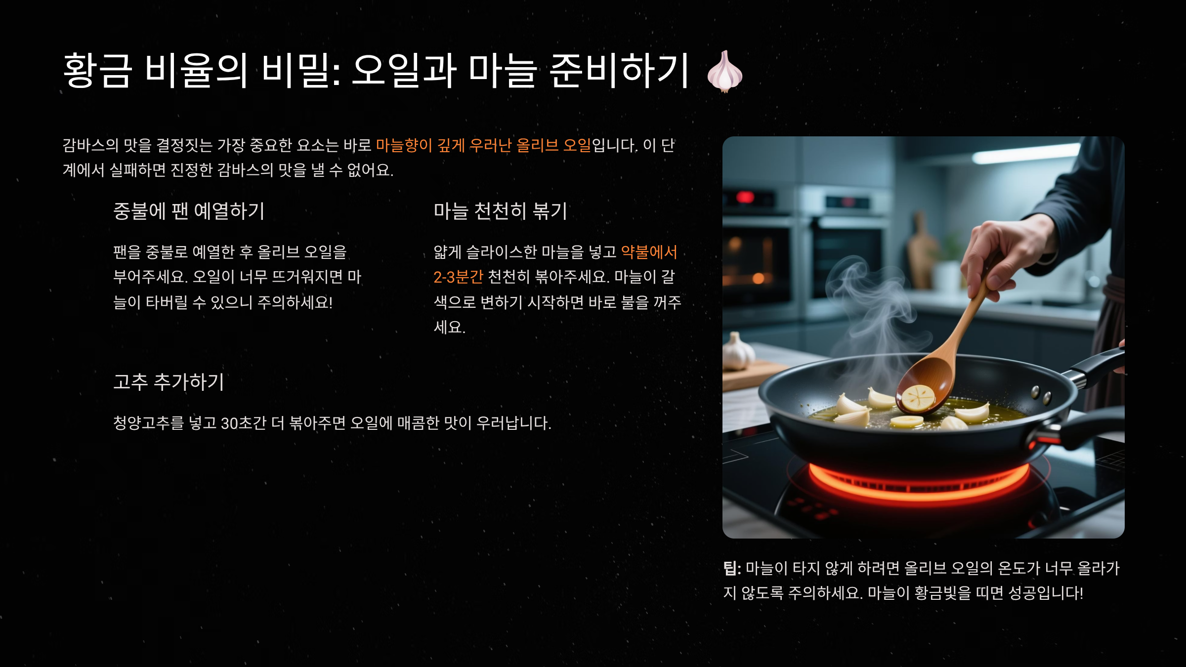 맛있는 감바스 파스타의 핵심은 바로 오일에 마늘 향을 완벽하게 입히는 것입니다. 팬에 올리브 오일을 넉넉하게 두르고 편 썰기한 마늘을 넣습니다. 불은 약불을 사용해야 합니다. 너무 센 불에 마늘을 볶으면 겉만 타고 속은 익지 않아 쓴맛이 날 수 있기 때문이죠. 마늘이 노릇노릇해질 때까지 약 5~7분간 천천히 끓이듯이 익혀주세요. 마늘이 익어가면서 올리브 오일에 고소하고 깊은 향이 배어들게 됩니다. 이때 페페론치노를 넣으면 매콤한 풍미가 더해져 맛의 균형을 잡아줍니다. 마늘이 타지 않도록 불 조절에 특히 유의하는 것이 중요합니다. 마늘이 황금빛을 띠면 잠시 불을 끄고 다음 단계로 넘어갈 준비를 합니다.