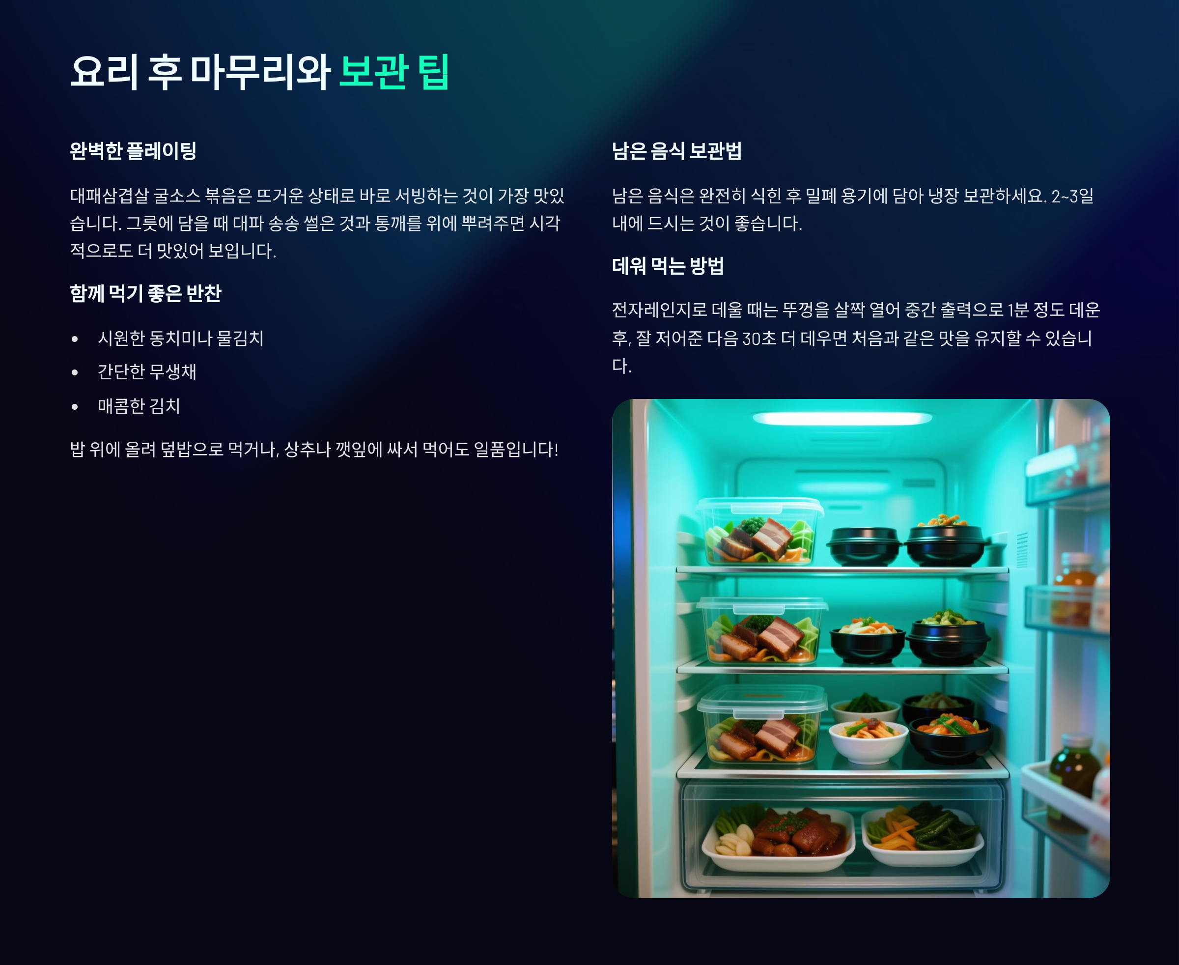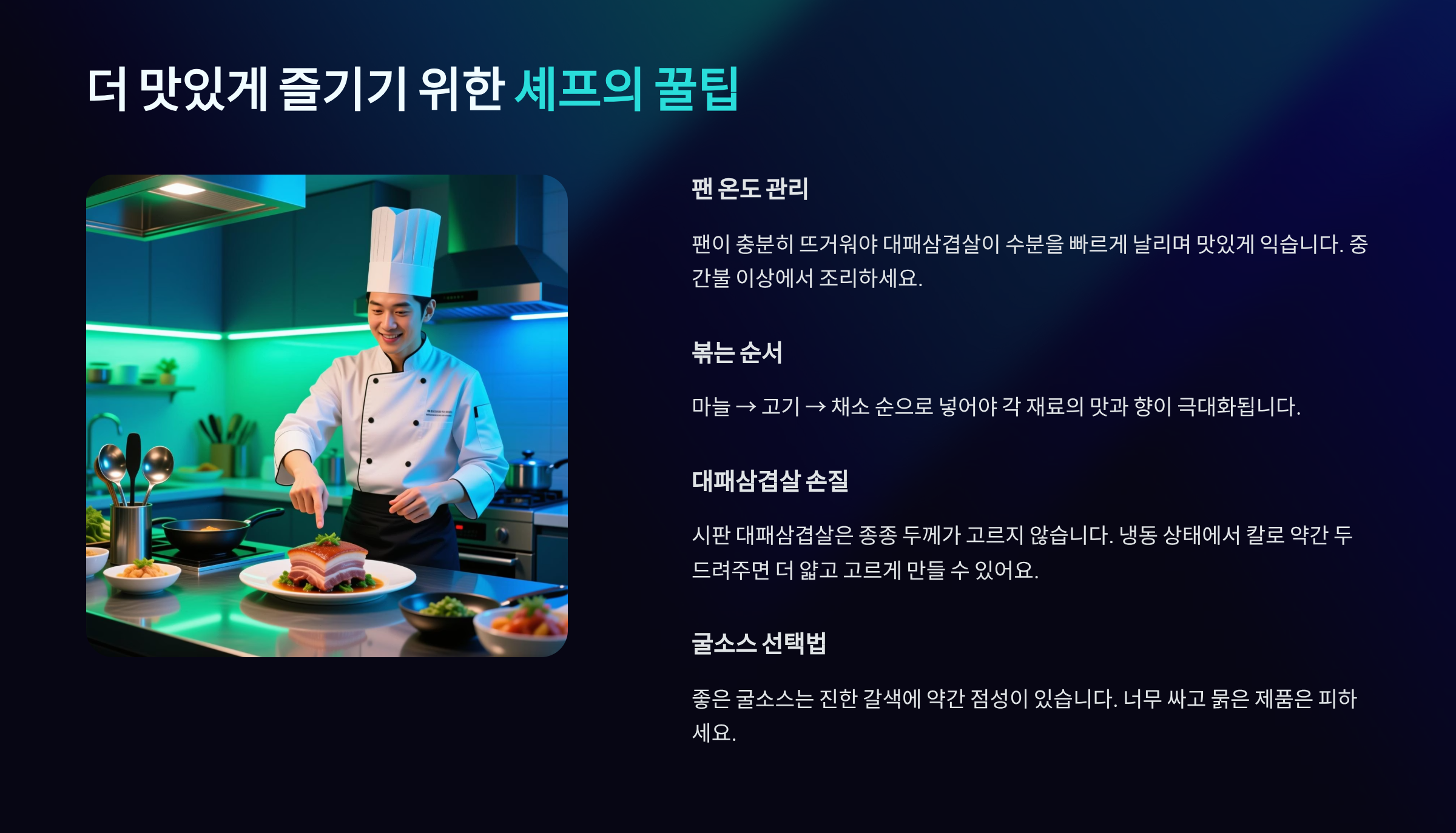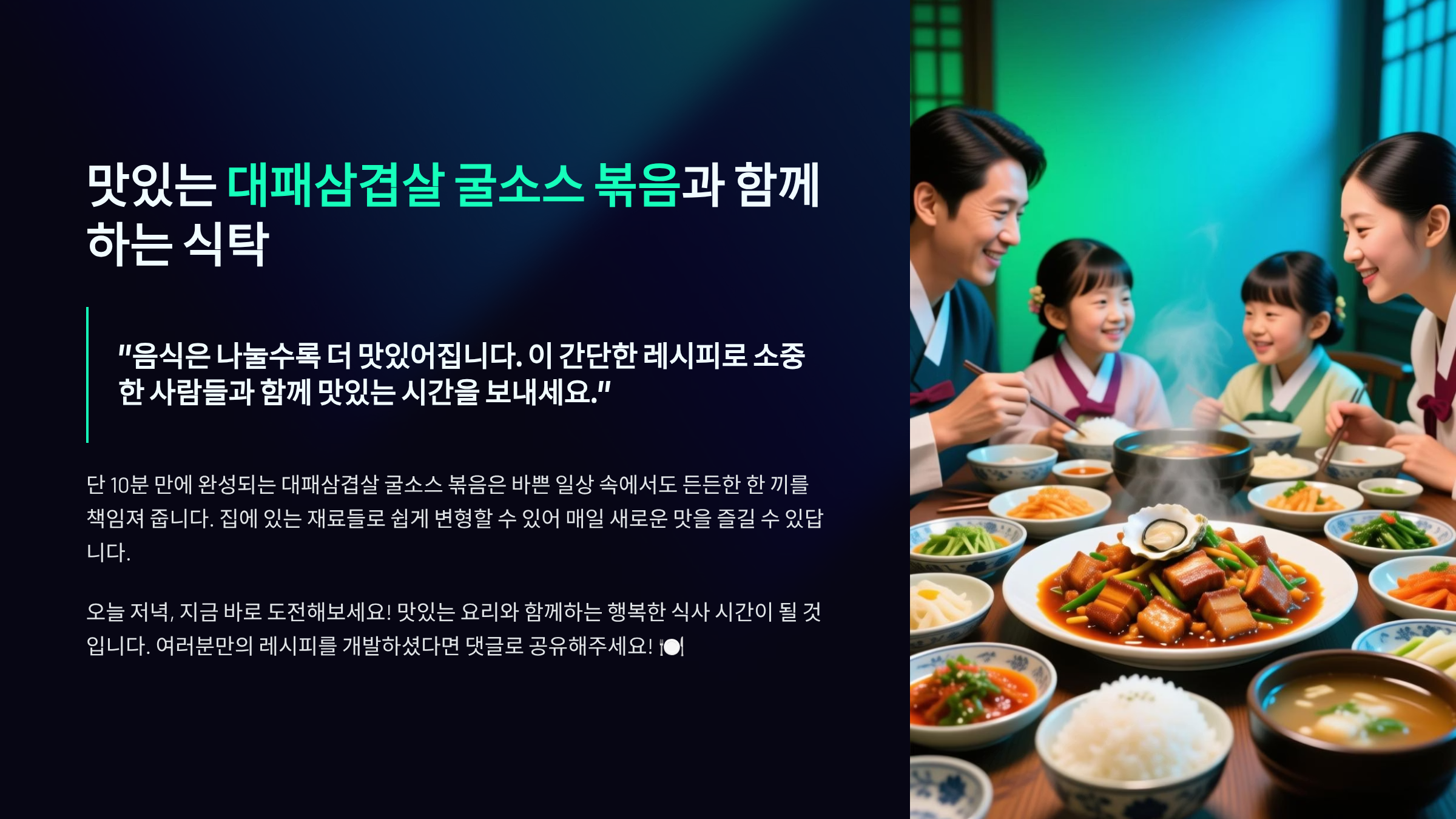 대패삼겹살 파채 굴소스 볶음은 간단한 재료와 조리법으로도 충분히 깊은 맛을 낼 수 있는 효자 메뉴입니다. 오늘 저녁, 이 레시피로 맛있는 식사를 만들어 보세요. 더 궁금한 점이 있다면 언제든지 물어봐주세요! 😊