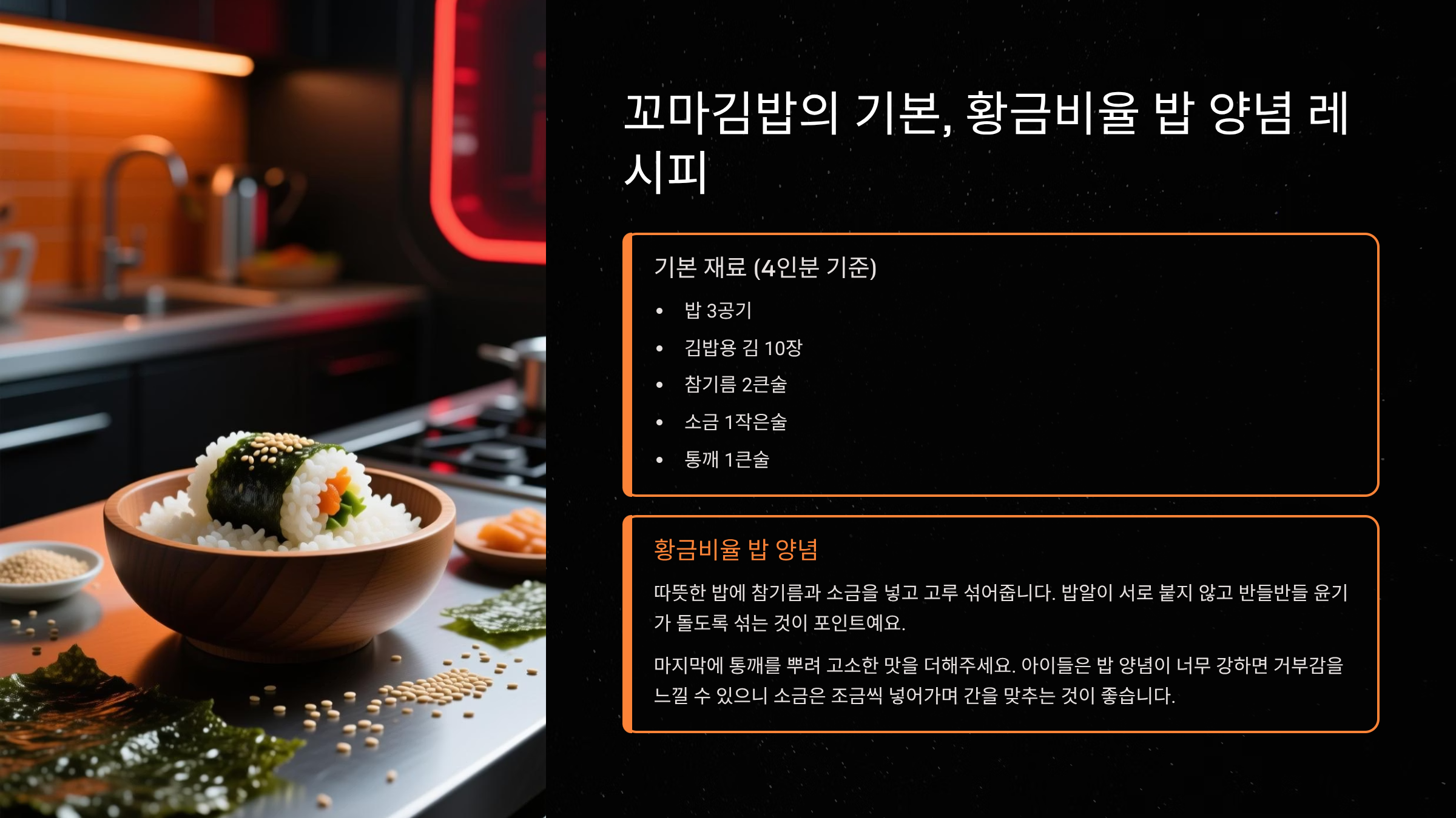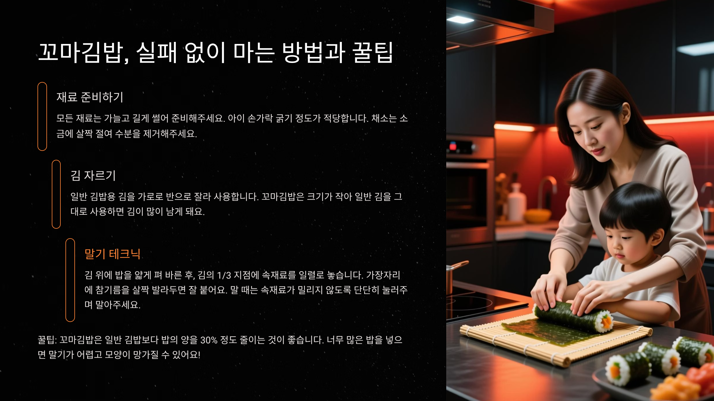 아이의 소풍 도시락, 혹은 간단한 한 끼 식사로 꼬마김밥만큼 좋은 메뉴가 또 있을까요? 작고 귀여운 비주얼 덕분에 아이들이 먼저 찾지만, 막상 만들려고 하면 재료 준비부터 과정까지 만만치 않게 느껴지기도 합니다. 밥이 딱딱해지거나, 속 재료가 삐져나오거나, 심지어 아이가 예상치 못한 재료를 거부하는 경우도 있죠. 하지만 걱정하지 마세요. 이 글에서는 아이의 입맛과 건강을 동시에 만족시키는 꼬마김밥 황금레시피와 함께, 초보자도 실패 없이 만들 수 있는 모든 노하우를 담았습니다. 밥 짓는 법부터 찰떡궁합 속 재료 조합, 그리고 한 번 만들면 두고두고 활용할 수 있는 꿀팁까지, 지금부터 함께 알아보겠습니다. 📝