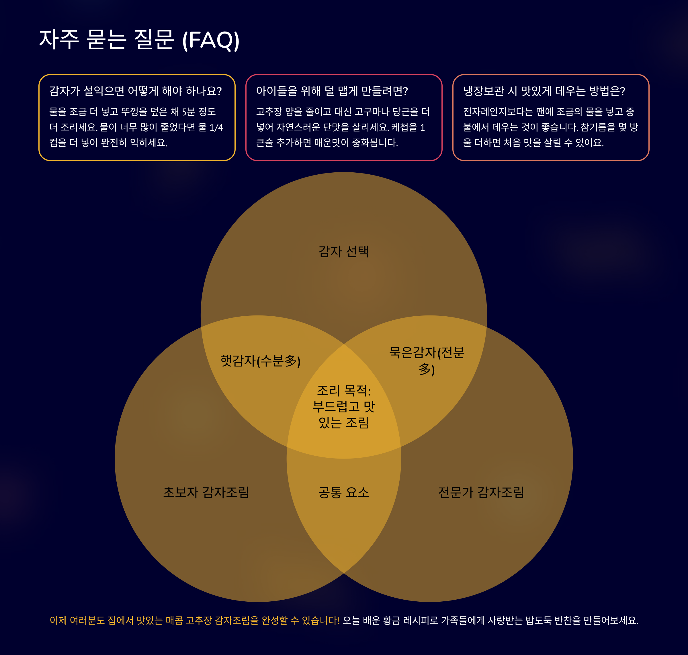 매콤 고추장 감자조림은 단순한 요리지만, 작은 비법들을 적용하면 누구나 완벽한 맛을 낼 수 있습니다. 이 글에서 소개한 꿀팁들을 활용하여 오늘 저녁, 따뜻한 밥과 함께 맛있는 감자조림을 만들어 보세요. 더 궁금한 점이 있다면 언제든지 댓글로 물어봐주세요! 😊