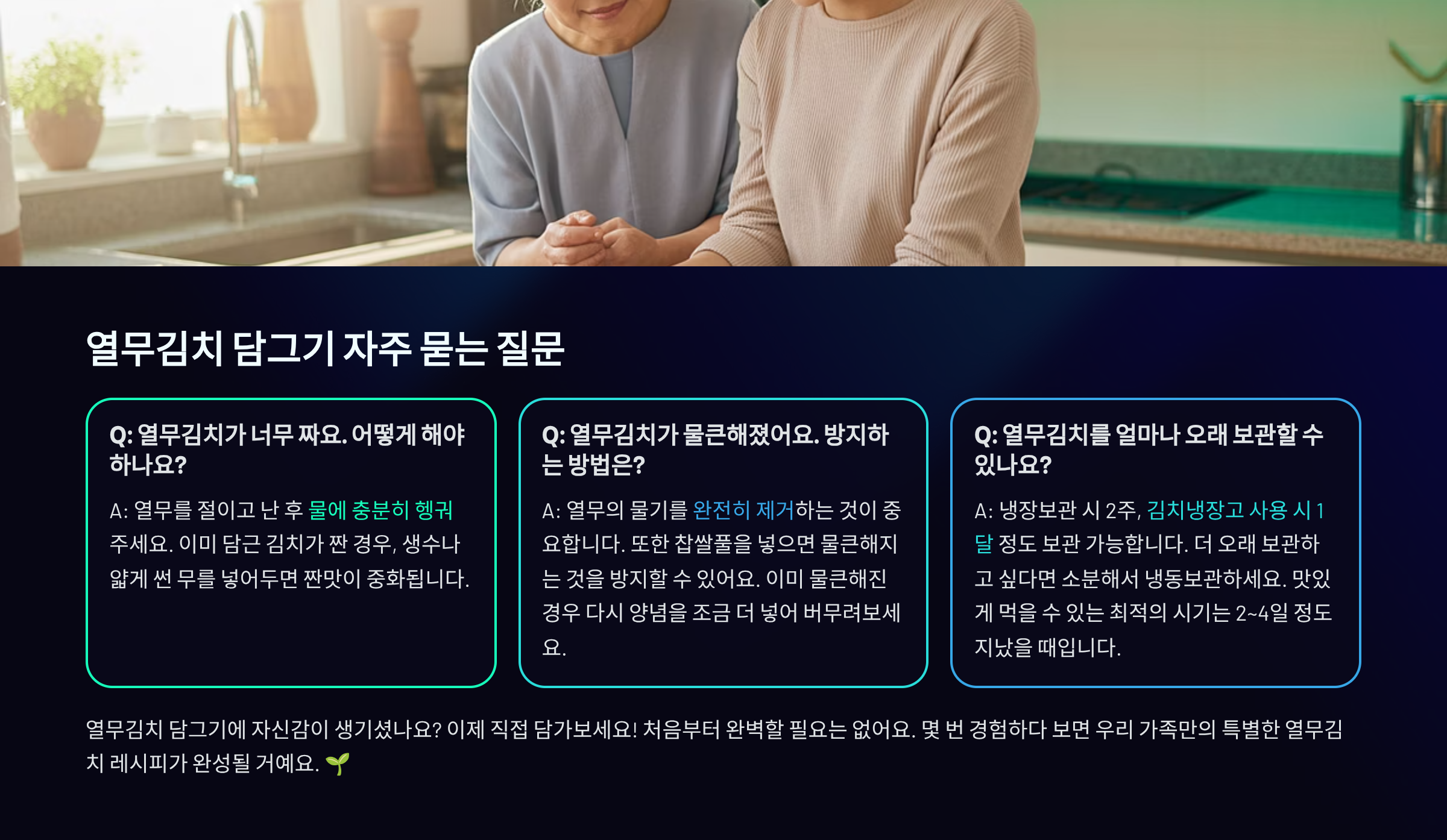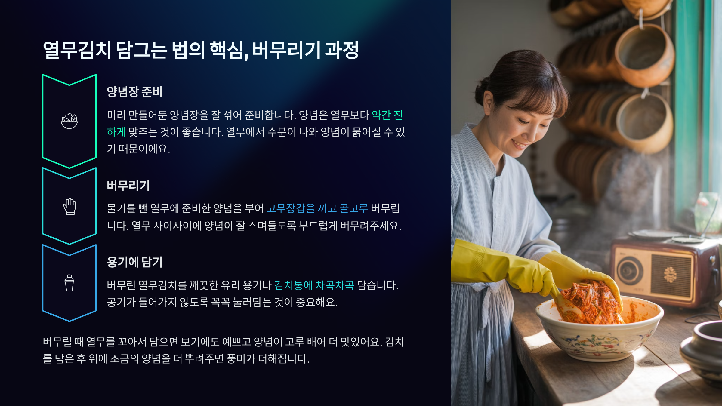 지금까지 열무김치 담그는 법의 모든 과정을 상세하게 살펴보았습니다. 싱싱한 열무를 고르고, 짜지 않게 절이며, 황금 비율의 양념을 만들어 살살 버무리는 과정만 잘 따라하면 누구나 맛있는 열무김치를 만들 수 있습니다. 직접 담근 김치는 정성만큼이나 맛과 신선함이 뛰어납니다. 이 글이 여러분의 첫 열무김치 담그기에 큰 도움이 되기를 바랍니다. 궁금한 점이 있다면 언제든지 댓글로 남겨주세요!
