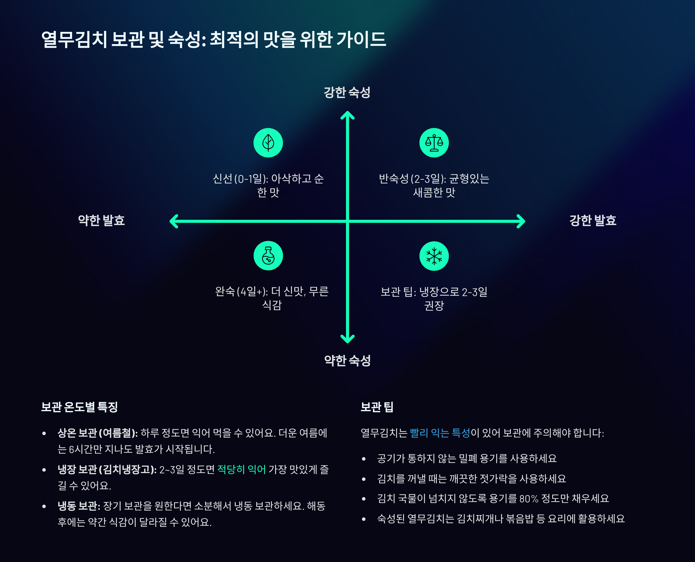 💡 알아두세요! 열무김치를 담은 직후에 바로 냉장고에 넣으면 발효가 더디게 진행되어 맛이 덜할 수 있습니다. 최소 반나절 정도 실온 숙성 과정을 거치는 것을 추천합니다.