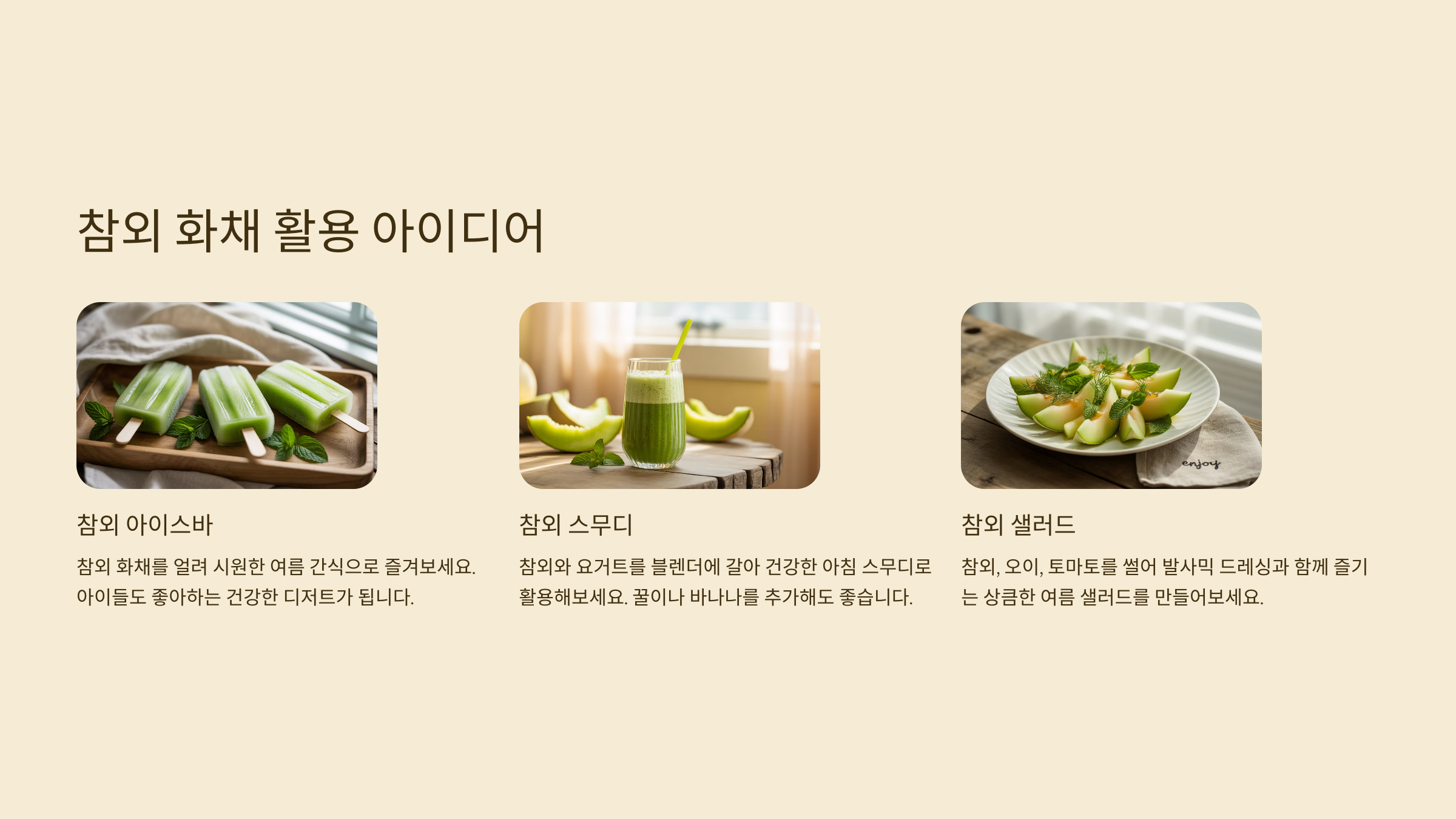 제가 생각했을 때, 참외는 맛뿐 아니라 몸에도 좋은 건강 과일이라 화채뿐만 아니라 다양한 요리와 간식에 활용해도 아주 만족스러운 재료예요.