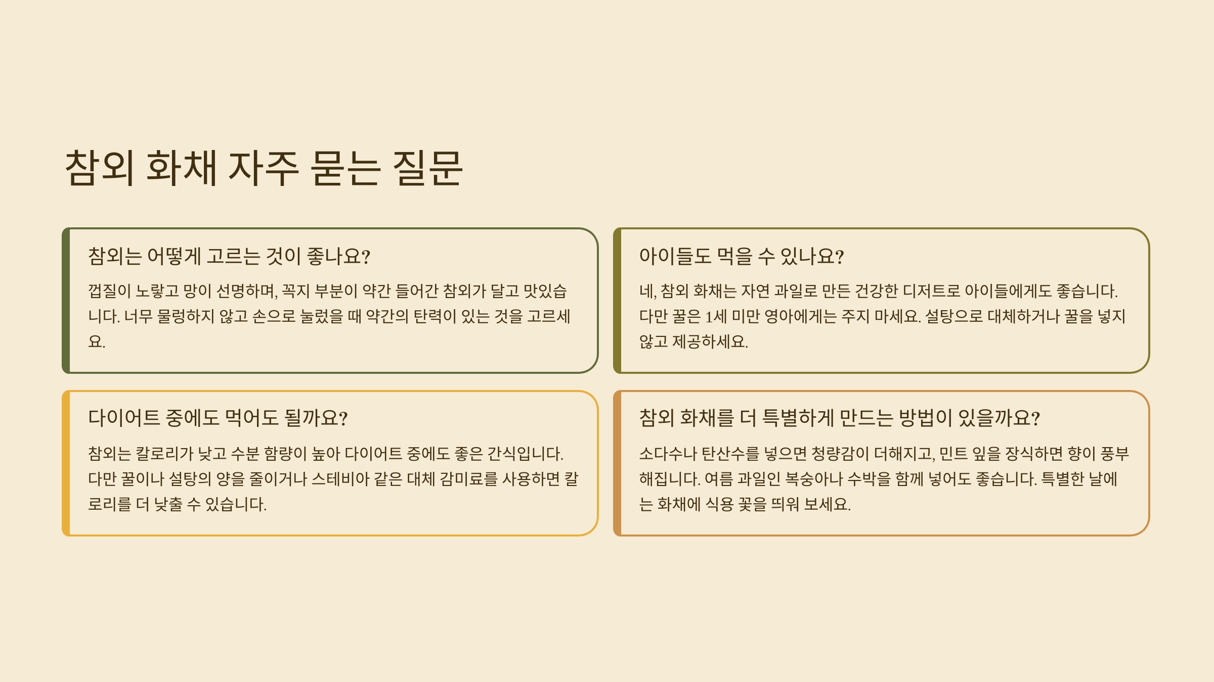 마지막으로 참외 화채에 관한 자주 묻는 질문들을 모아봤어요. 궁금증 해결에 도움 되길 바랍니다!