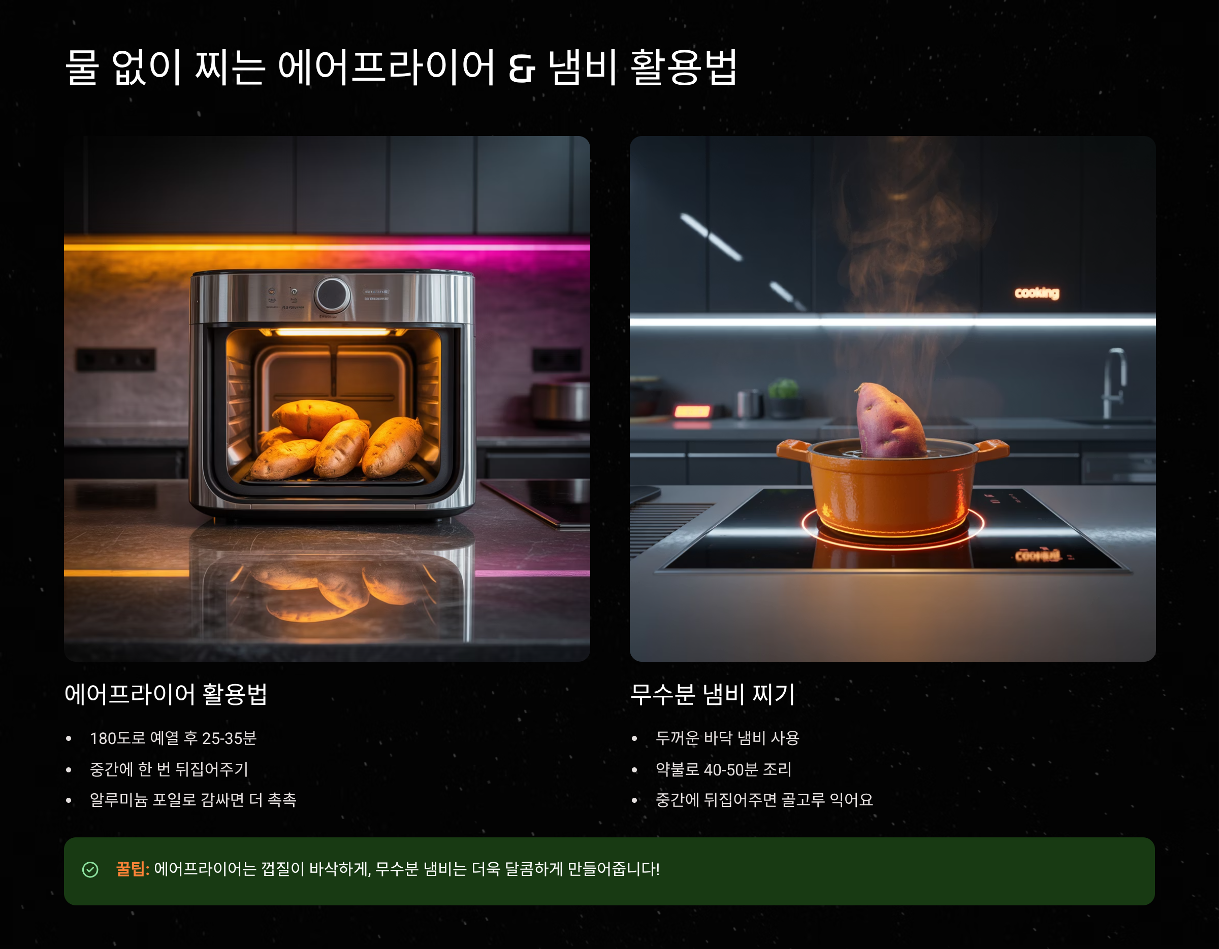 따뜻하고 달콤한 고구마는 남녀노소 모두가 좋아하는 간식입니다. 하지만 고구마를 잘못 찌면 퍽퍽하고 맛이 없어 실망하는 경우가 많죠. 고구마의 숨겨진 단맛을 끌어내려면, 올바른 '찌는 법'이 매우 중요합니다. 이 글에서는 냄비, 에어프라이어, 전자레인지 등 다양한 도구를 활용하여 고구마를 가장 맛있게 찌는 모든 방법을 알려드립니다. 단순한 찌는 시간을 넘어, 꿀맛 고구마를 만드는 숙성 노하우부터 다시마를 활용한 비법까지, 전문가의 꿀팁을 총망라했습니다. 이제 퍽퍽한 고구마는 잊고, 온 가족이 감탄하는 촉촉하고 달콤한 찐 고구마를 만들어보세요! 🍠