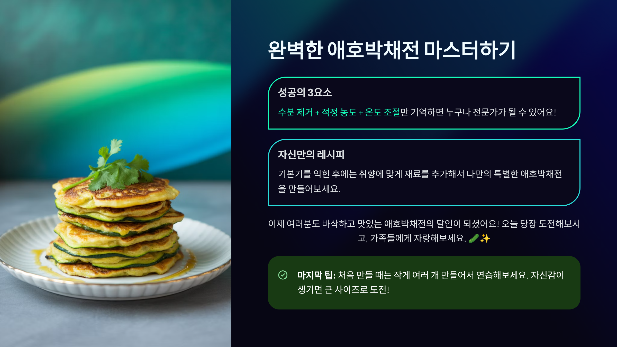 오늘 소개해드린 바삭한 애호박채전 황금레시피가 여러분의 요리 생활에 큰 도움이 되기를 바랍니다. 누구나 쉽게 따라 할 수 있는 간단한 비법들이지만, 이 작은 차이가 완벽한 맛을 만들어냅니다. 겉은 바삭하고 속은 촉촉한 애호박채전을 가족들과 함께 즐기며 행복한 시간을 보내세요. 더 궁금한 점이 있다면 언제든지 댓글로 물어봐주세요. 😊
