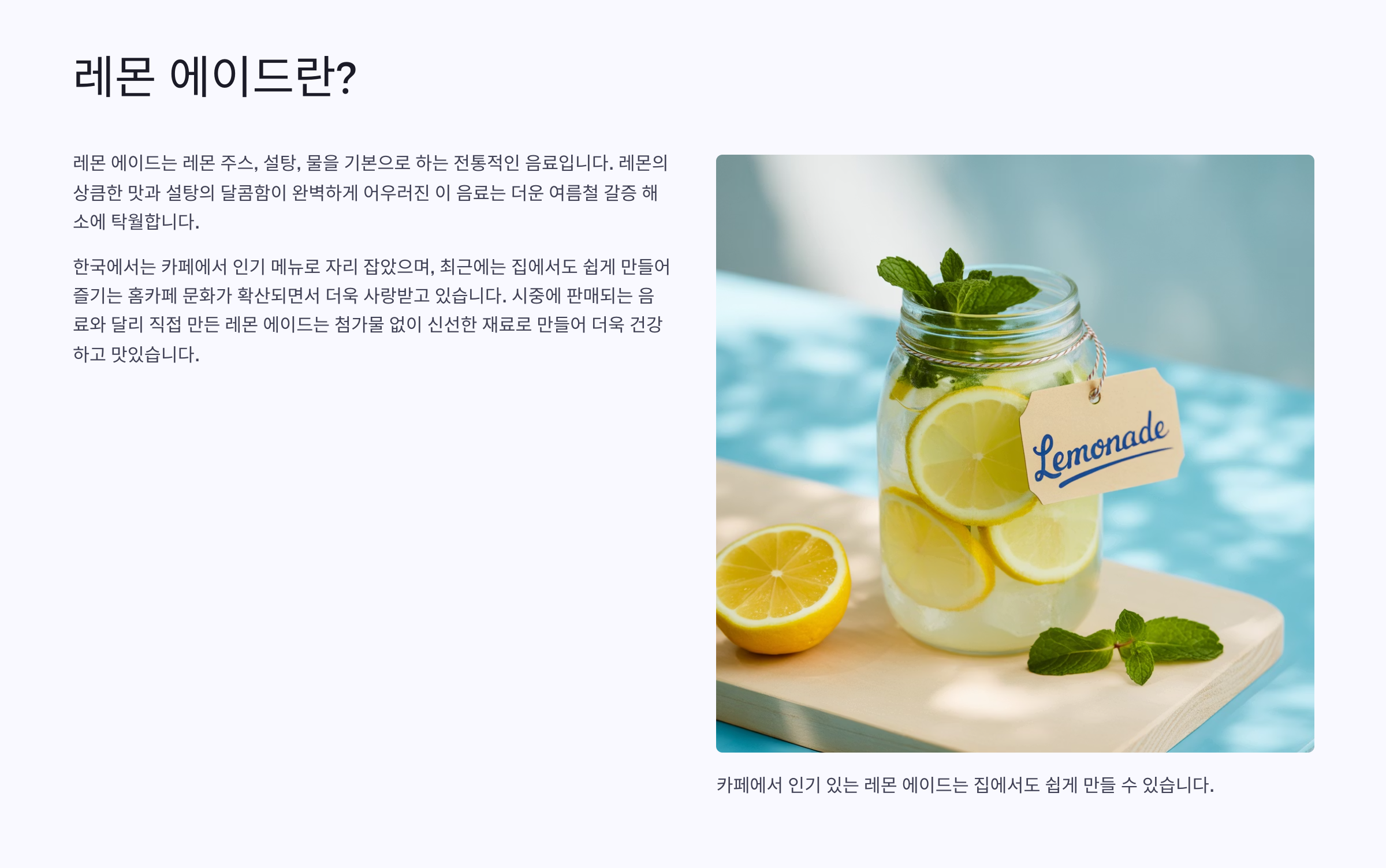 | 클래식 레몬 에이드 | 레몬즙, 설탕, 물 | 기본 맛 | 상큼 달콤 | 일상 음료 |