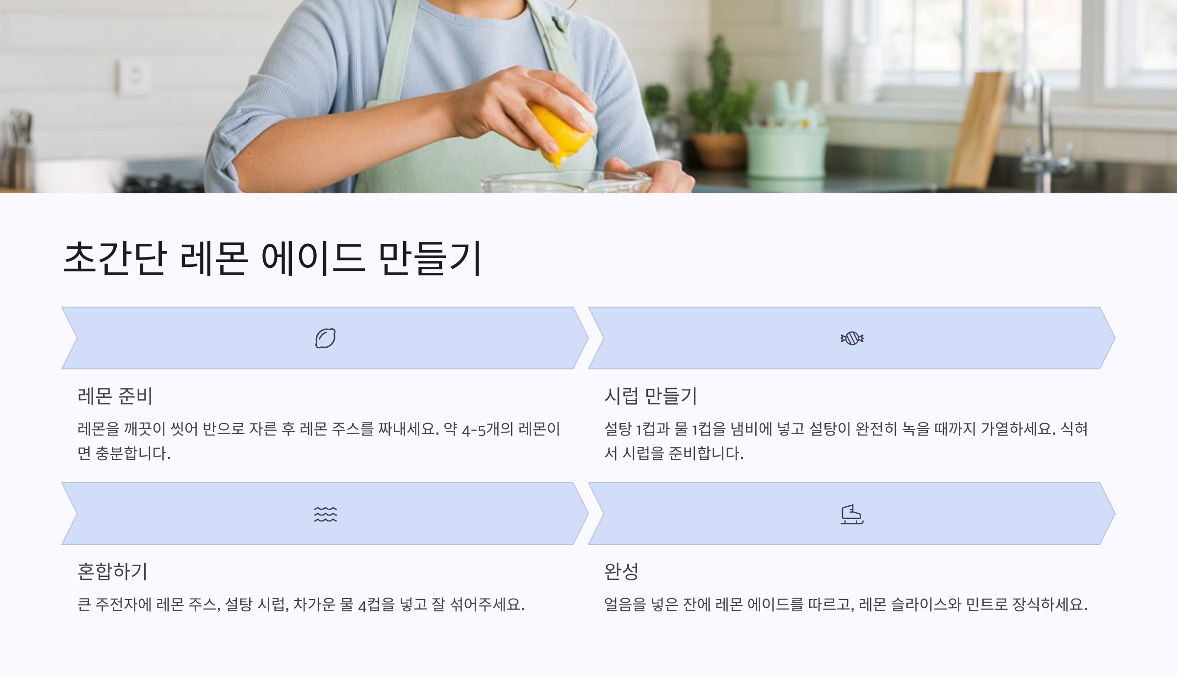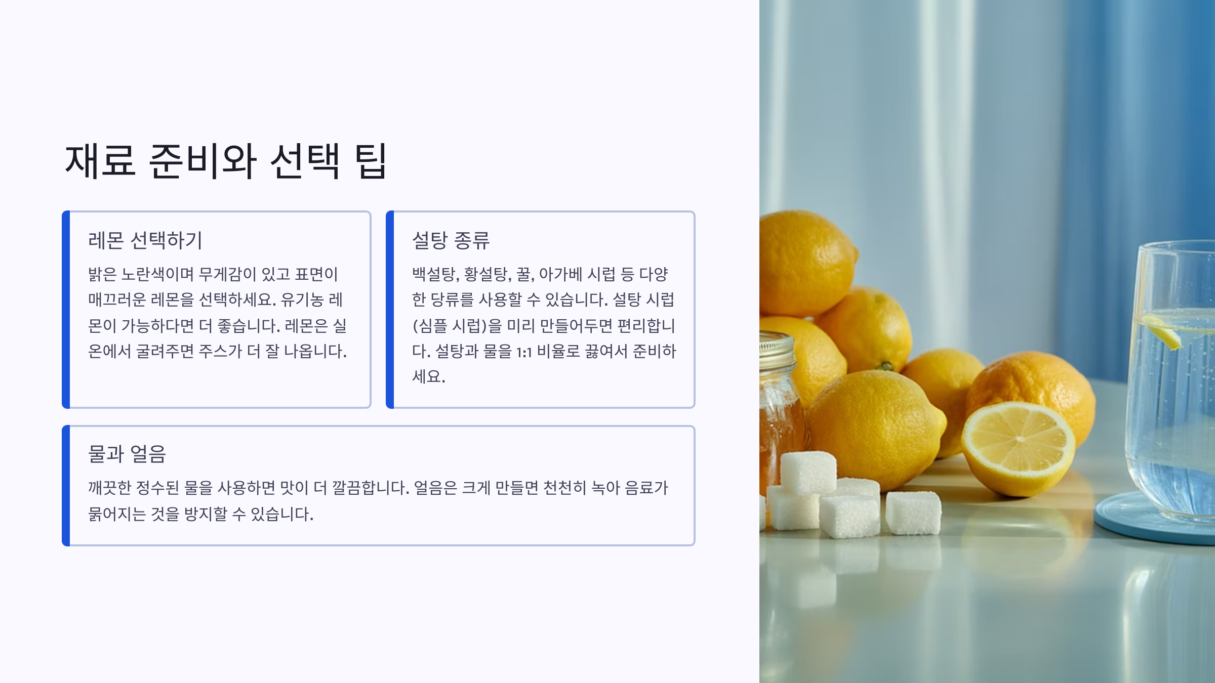 좋은 재료를 준비하면 레몬 에이드 맛이 확 달라져요. 꼼꼼하게 고르는 게 포인트랍니다! 🍋