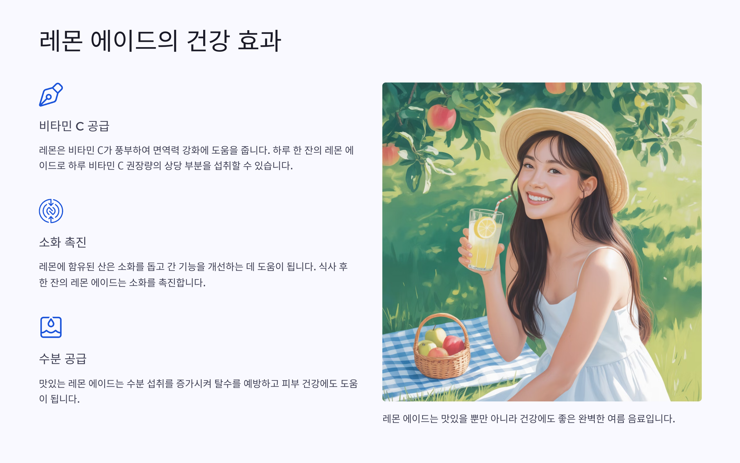 레몬은 비타민 C가 풍부해 면역력 강화에 좋아요. 레몬 에이드를 마시면 더위로 지친 몸을 회복하는 데 도움이 된답니다.