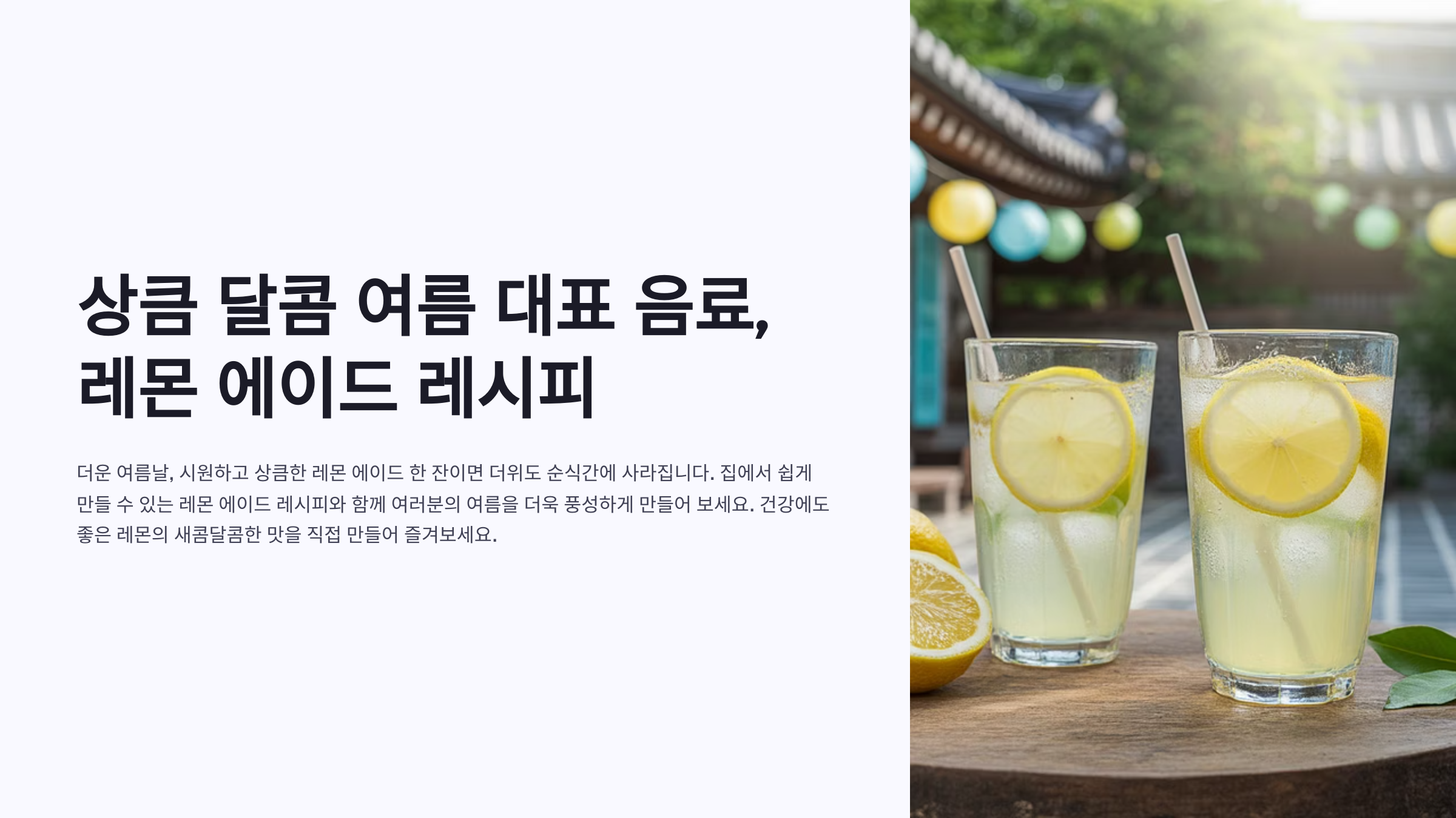 무더운 여름, 갈증을 한 방에 날려버릴 최고의 홈카페 음료! 비타민C 가득한 레몬에이드로 지친 일상에 활력을 더하고, 여러분만의 특별한 레시피를 직접 만들어보세요.