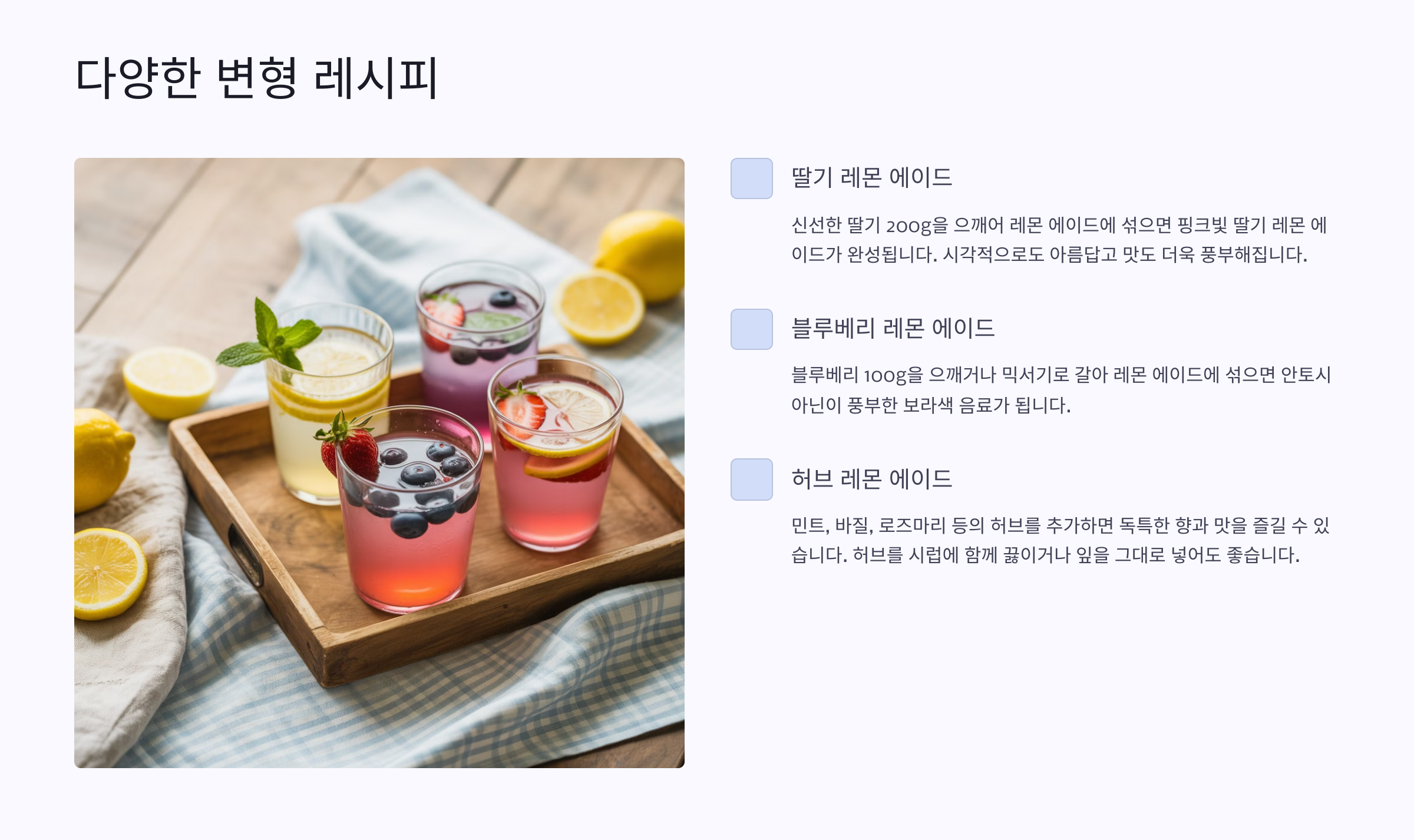 취향에 따라 다양하게 변형해 나만의 레몬 에이드를 만들어 보세요! 🍋🌿