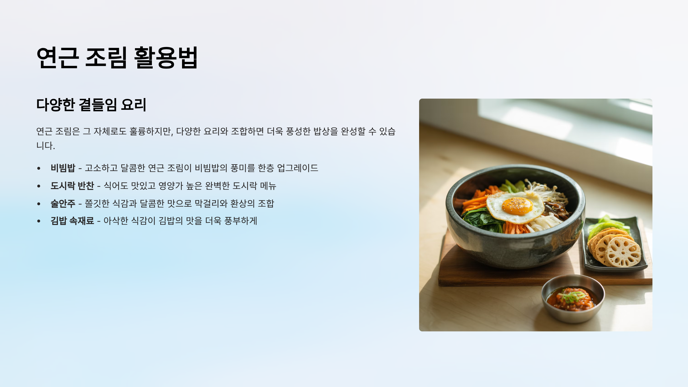 잘 만든 연근 조림은 그 자체만으로도 훌륭한 반찬이지만, 다른 요리와 함께 곁들이거나 색다르게 활용하면 더욱 풍성한 식탁을 만들 수 있습니다. 가장 간단한 활용법은 밥과 함께 먹는 것이지만, 김밥 속 재료로 활용하면 아삭한 식감과 달콤 짭짤한 맛이 더해져 특별한 김밥을 만들 수 있습니다. 밥 위에 잘게 다진 연근 조림을 올리고 참기름을 살짝 뿌려 비빔밥처럼 즐기는 것도 좋은 방법입니다. 이 외에도 샌드위치나 샐러드에 잘게 썬 연근 조림을 넣어 독특한 풍미와 식감을 더할 수 있습니다. 곁들임 요리로는 담백한 생선구이나 고기 요리와 함께 내면 좋습니다. 연근 조림의 깔끔한 맛이 기름진 요리의 맛을 잡아주어 조화로운 식사를 즐길 수 있습니다. 특히, 닭볶음탕이나 돼지고기 두루치기 같은 매콤한 메인 요리 옆에 두면 매운맛을 중화시켜주면서도 입맛을 돋우는 역할을 합니다. 이처럼 연근 조림은 다양한 요리와 훌륭한 궁합을 자랑하며, 한 가지 반찬으로 여러 가지 메뉴를 즐길 수 있게 해주는 팔방미인입니다. 여러분의 밥상에 맛과 건강을 더해줄 연근 조림, 다양하게 활용해 보세요.