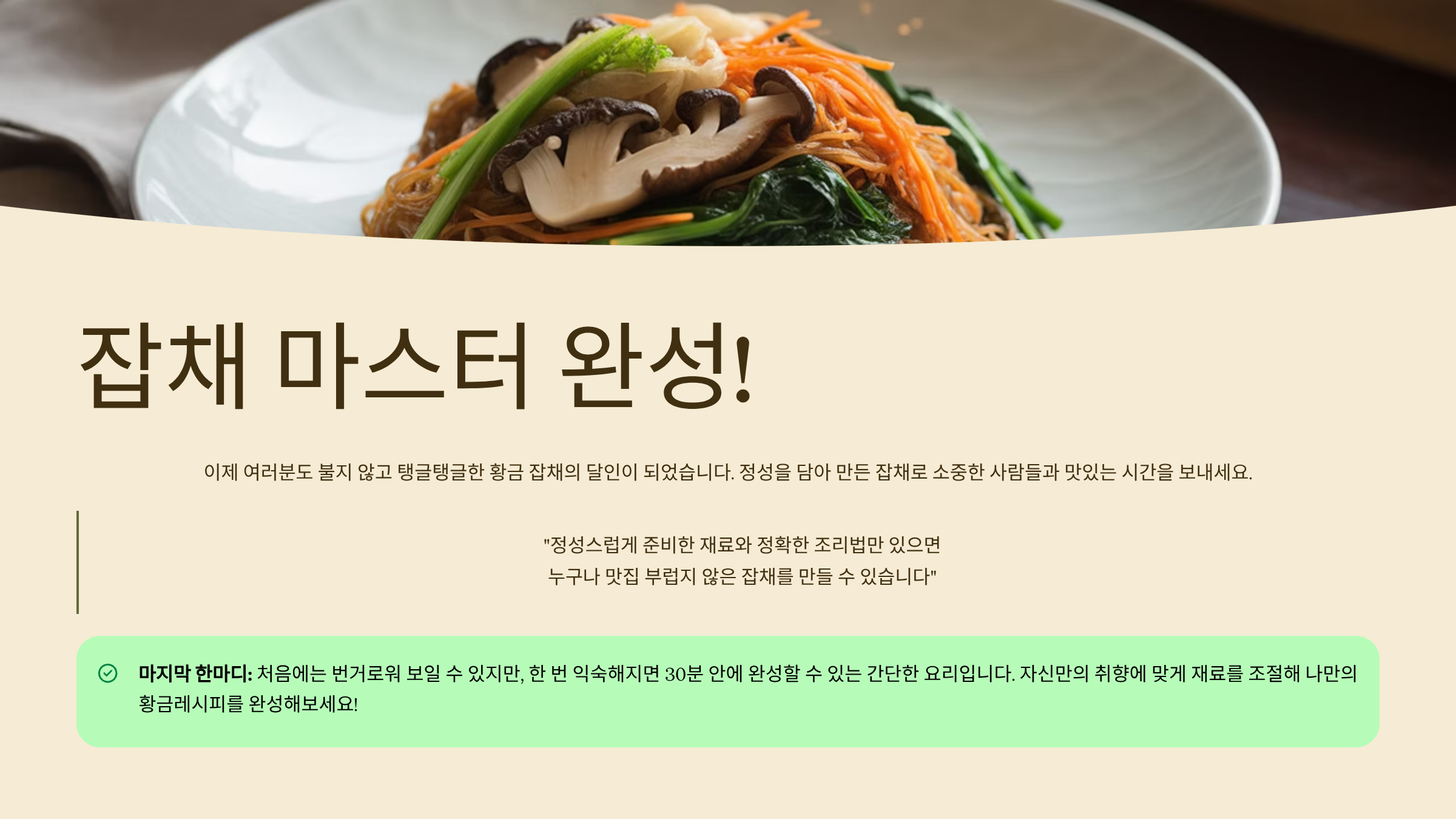 이제 잡채 황금레시피의 모든 비법을 아셨으니, 집에서도 불지 않고 맛있는 잡채를 쉽게 만드실 수 있을 거예요. 이 가이드가 여러분의 식탁을 더욱 풍성하게 만드는 데 도움이 되기를 바랍니다. 더 궁금한 점이 있다면 언제든지 댓글로 남겨주세요! 😊