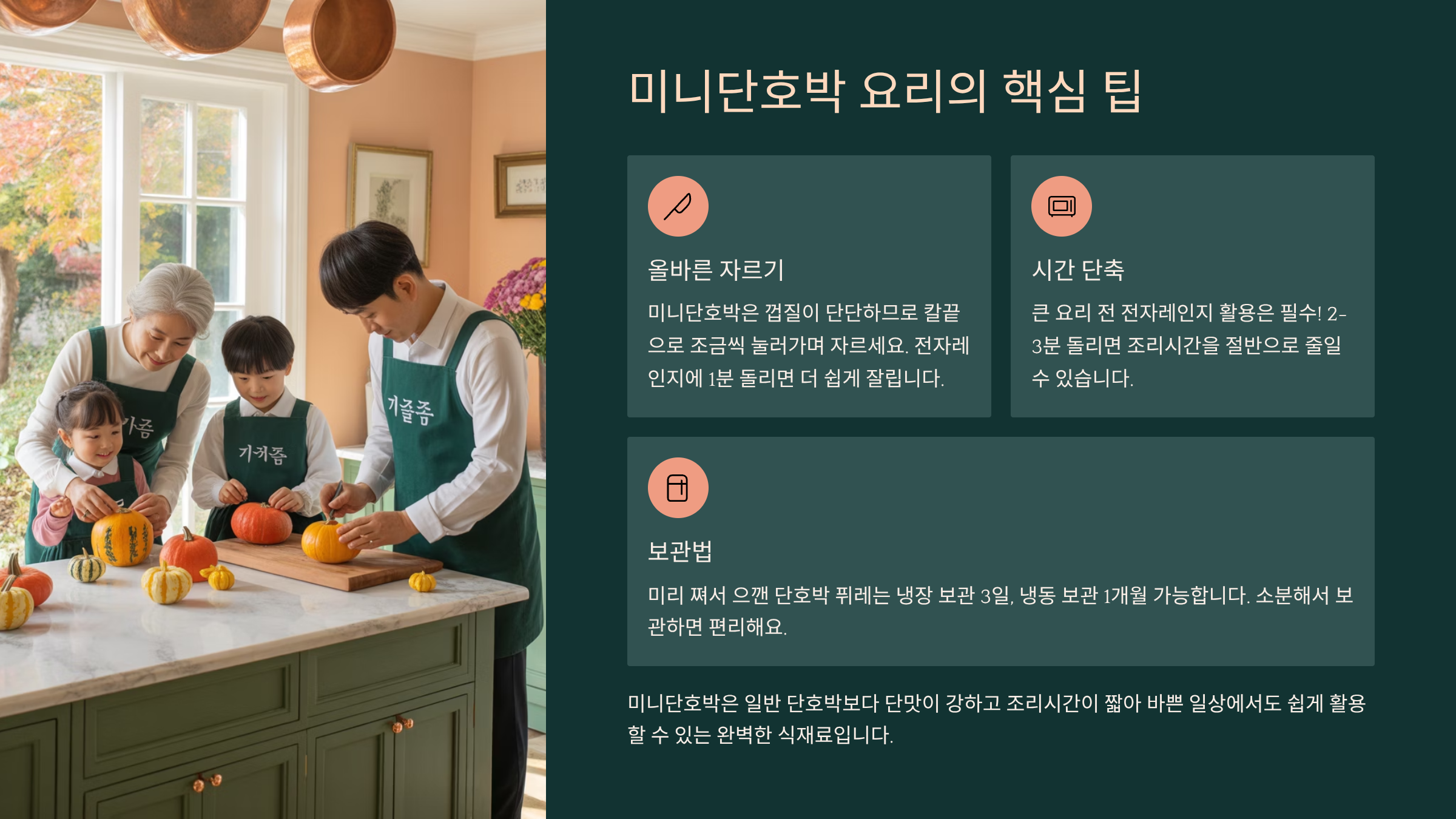 쌀쌀한 가을 저녁, 따뜻하고 부드러운 미니단호박 스프 한 그릇이면 몸과 마음이 따뜻해집니다. 단호박의 자연스러운 단맛 덕분에 설탕을 넣지 않아도 충분히 맛있고, 부드러운 목 넘김으로 아이들은 물론 어르신들께도 좋은 메뉴입니다.