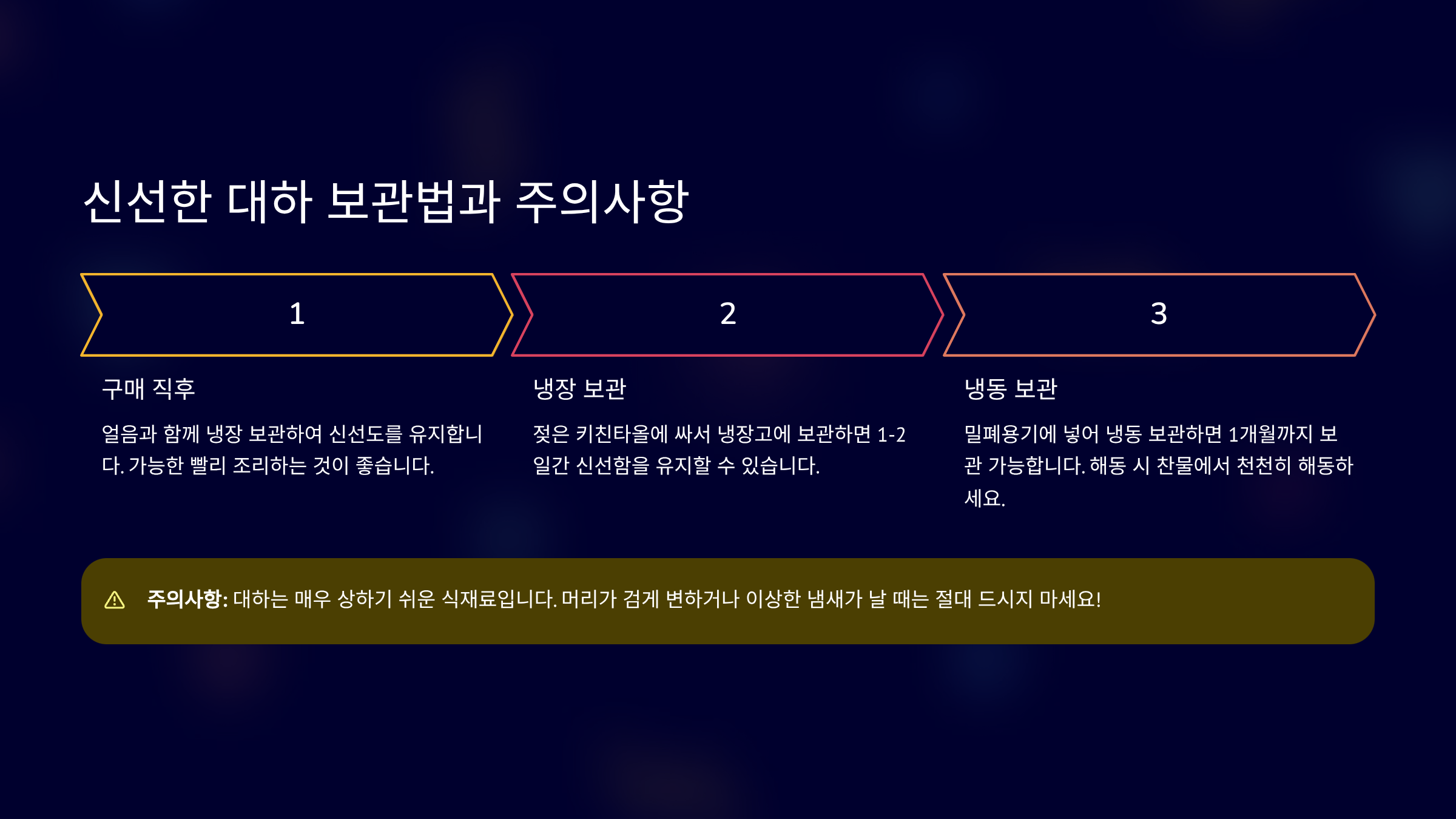 ⚠️ 주의하세요! 냉동 대하를 해동할 때는 흐르는 물에 직접 씻지 말고, 냉장고에서 천천히 해동하는 것이 식감 저하를 막는 좋은 방법입니다.