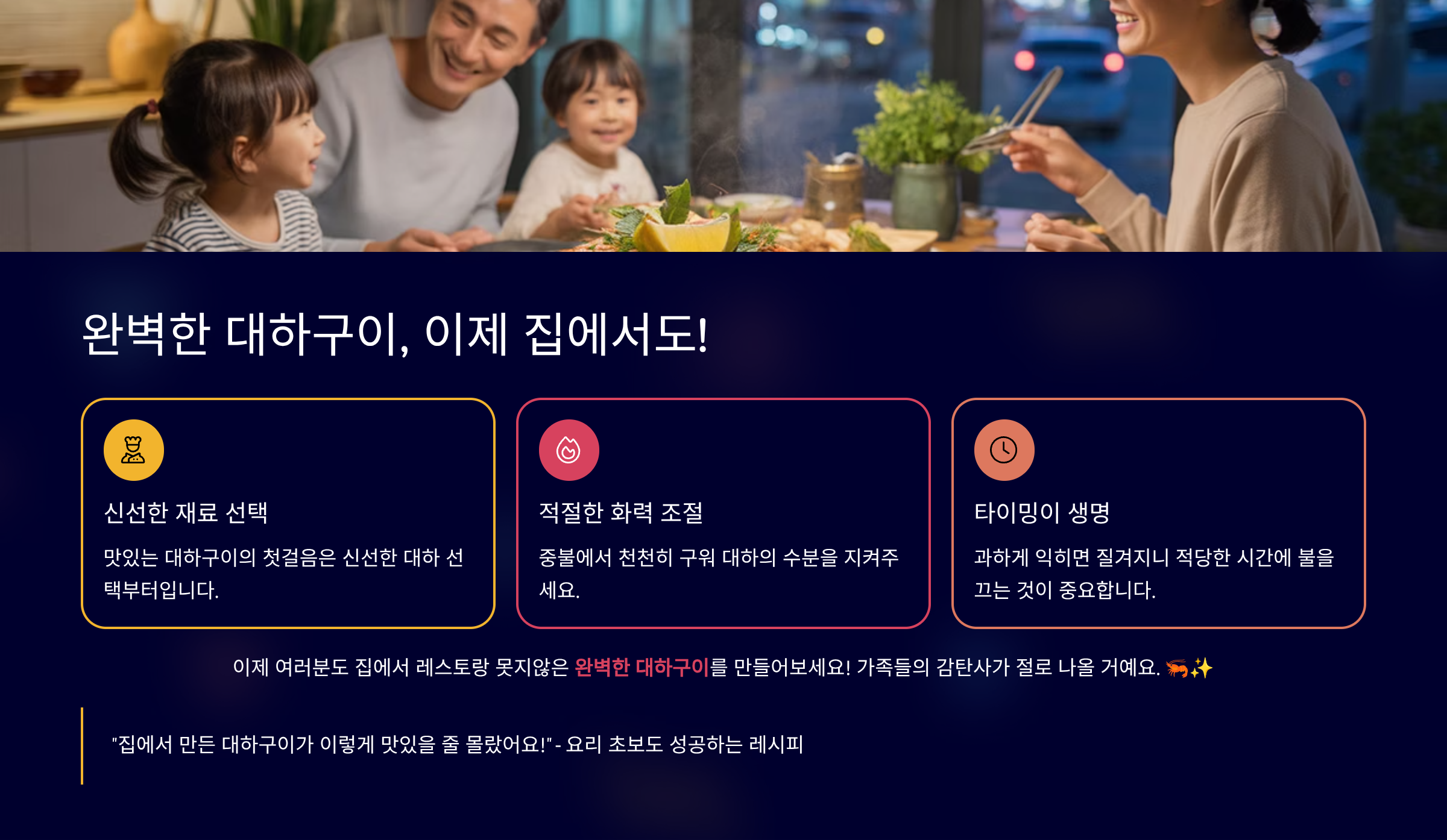 A: 네, 간단한 손질과 굽는 시간만 잘 지키면 초보자도 쉽게 맛있는 대하구이를 만들 수 있습니다.