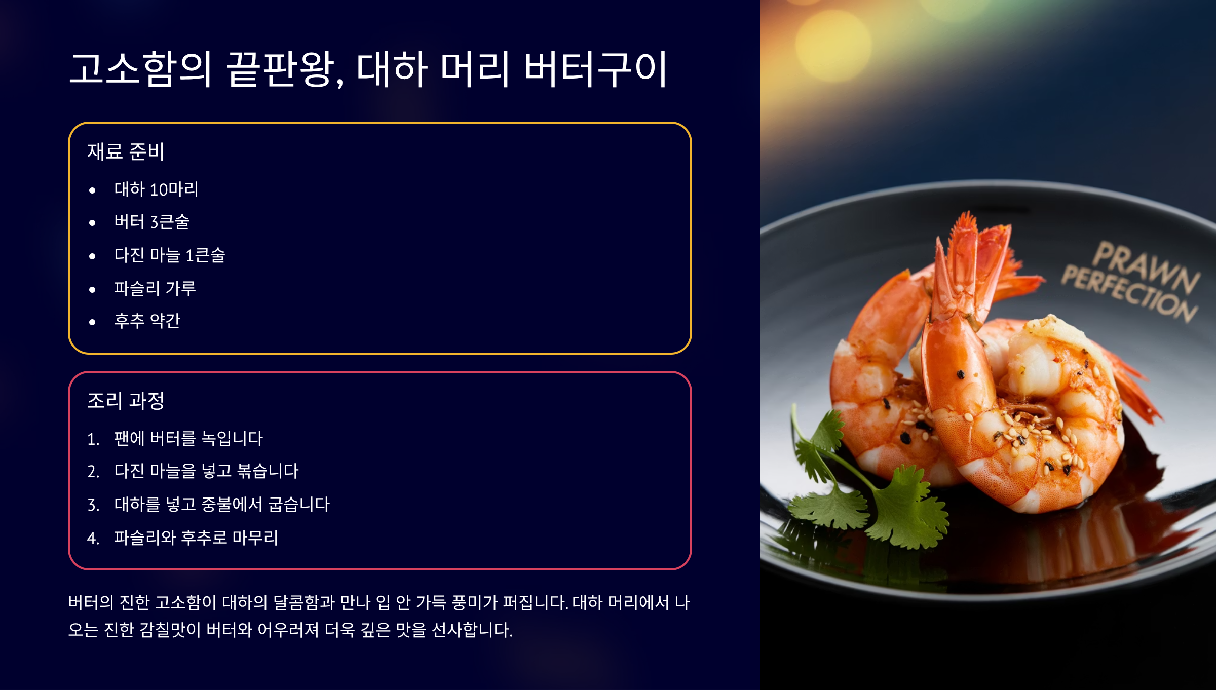 Q: 대하 머리 버터구이의 핵심은 무엇인가요?