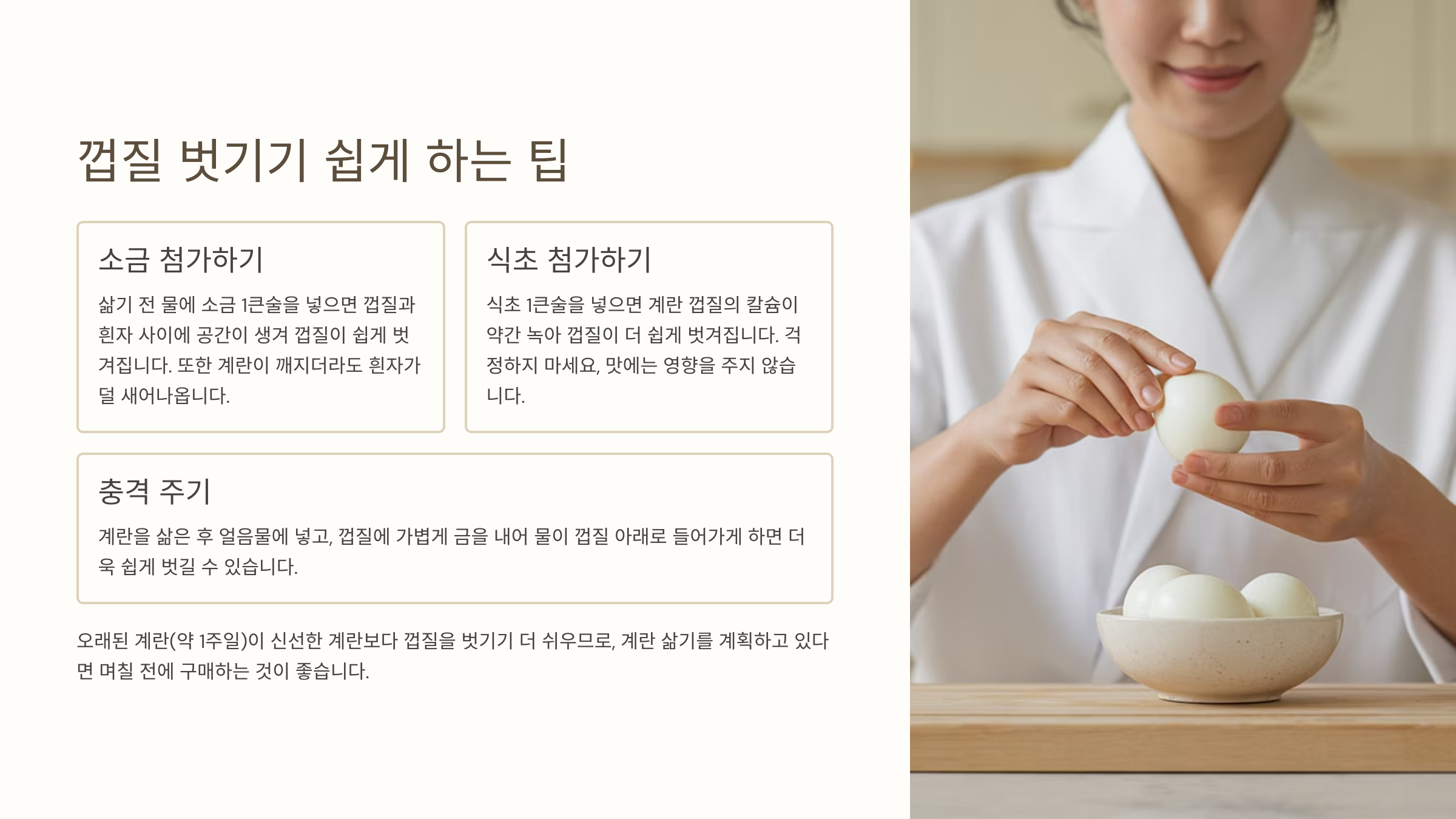 | 찬물에 즉시 담그기 | 삶은 후 얼음물에 담그기 | 껍질 쉽게 분리 |