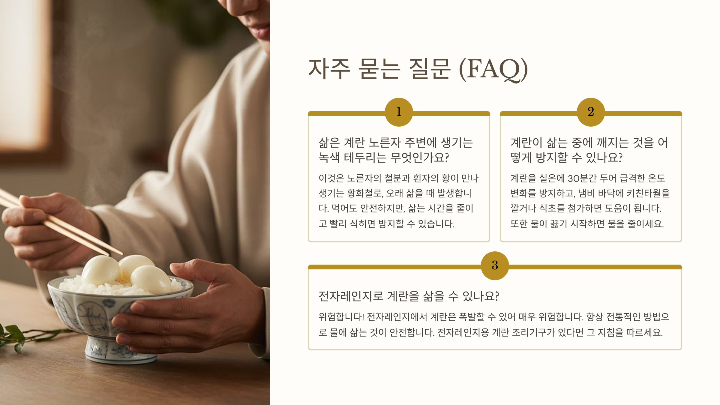 적절한 보관법만 잘 지켜도 삶은 계란의 신선함과 맛을 오래 유지할 수 있어요. 이제 FAQ로 자주 묻는 질문들을 풀어볼게요!