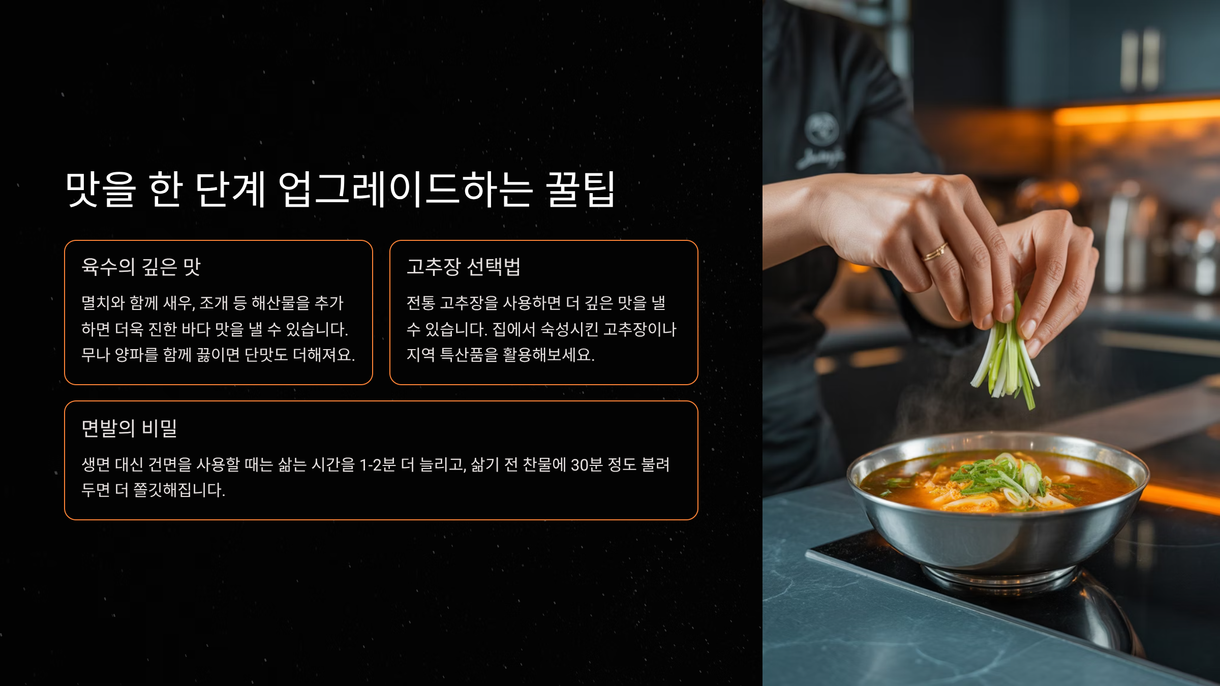 기본적인 고추장 칼칼 장칼국수 레시피도 충분히 맛있지만, 몇 가지 꿀팁을 더하면 한 단계 더 깊은 맛을 낼 수 있습니다. 첫 번째는 멸치 육수를 낼 때 건새우나 황태 머리를 함께 넣어 시원한 맛을 극대화하는 것입니다. 해산물에서 우러나온 감칠맛이 고추장과 어우러져 국물이 훨씬 풍부해집니다. 두 번째는 양념장에 설탕 대신 매실청을 사용하는 것입니다. 매실청의 새콤달콤한 맛이 고추장의 텁텁함을 잡아주고 자연스러운 단맛을 더해줍니다.