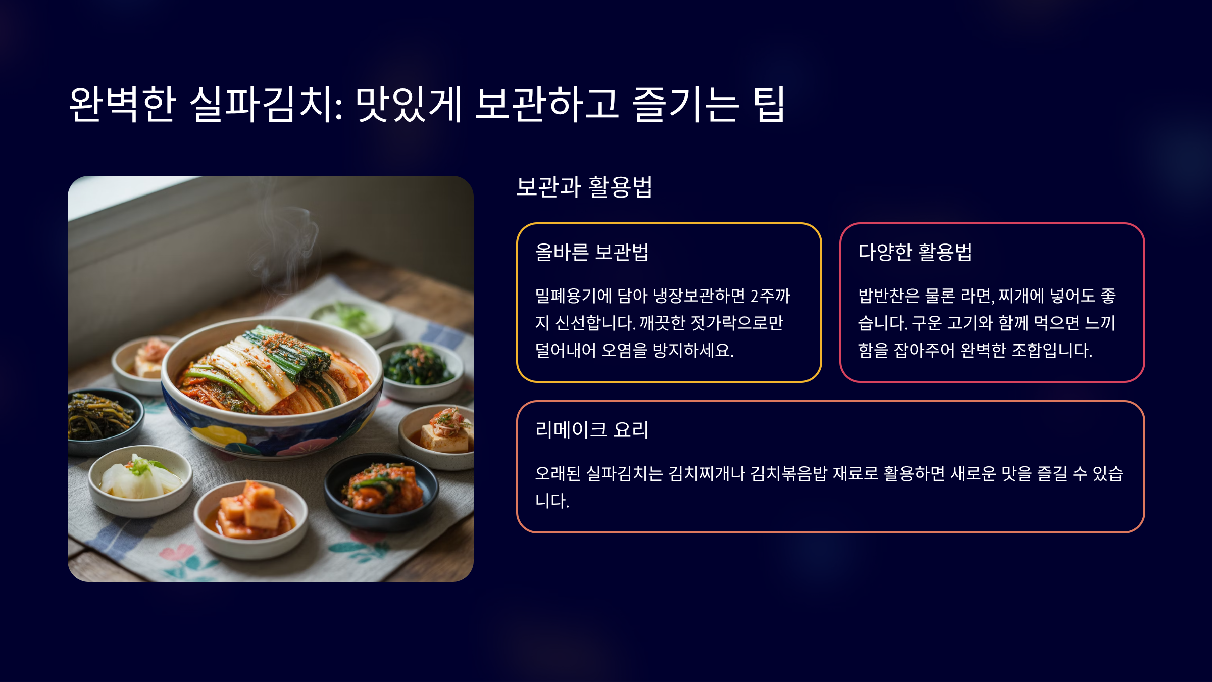 그리고 한 가지 꿀팁! 실파김치가 너무 시어지거나 물러졌을 때는 김치볶음밥에 활용하거나, 잘게 썰어 김치전으로 만들어 먹으면 새로운 맛을 즐길 수 있습니다. 실파김치 맛있게 담그는 방법과 보관 팁을 잘 활용하여 언제나 신선하고 맛있는 실파김치를 식탁에 올리세요.