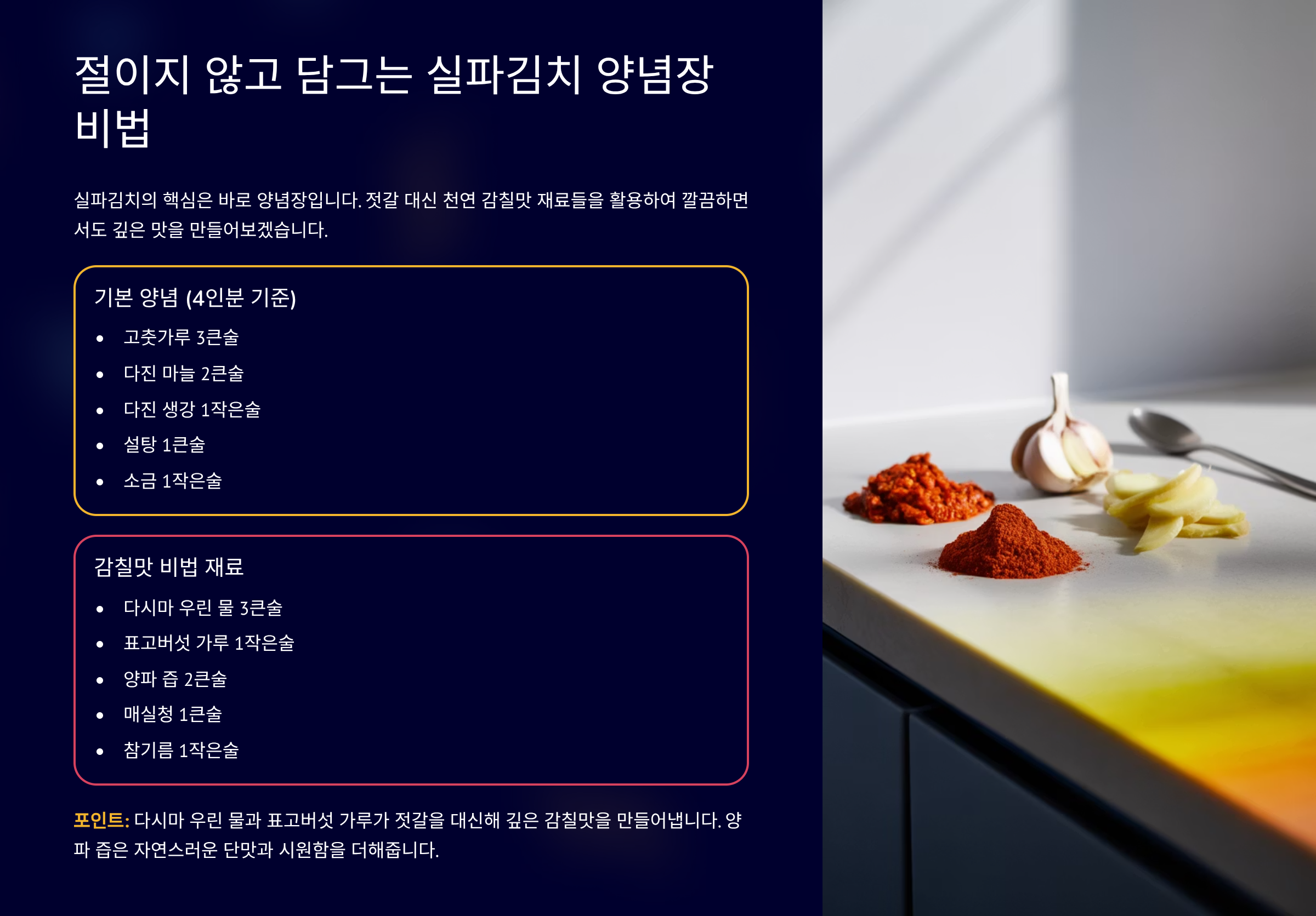 양념장을 만들 때는 모든 재료를 한 번에 넣고 섞는 것보다, 믹서기에 갈 재료(찬밥, 양파, 새우젓, 멸치액젓 5T)를 먼저 갈아준 후, 나머지 양념을 추가하여 농도를 맞추는 것이 중요합니다. 이렇게 하면 양념이 겉돌지 않고 재료와 잘 어우러집니다. 단맛은 배즙이나 사과즙, 매실액으로 내면 설탕보다 훨씬 깔끔하고 깊은 맛을 낼 수 있습니다.