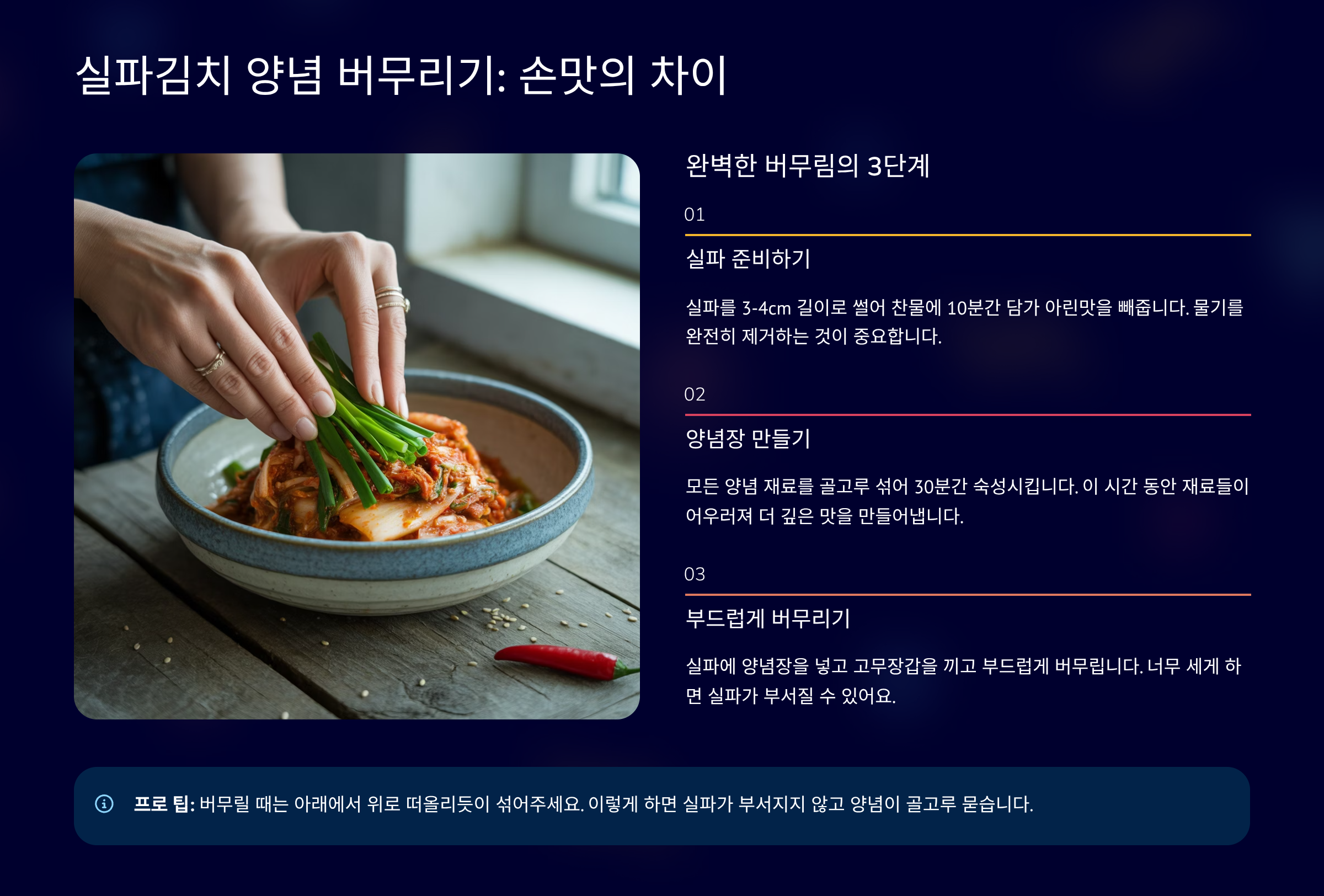 황금 레시피 보러가기실파김치 양념 버무리기: 손맛의 차이 🥢