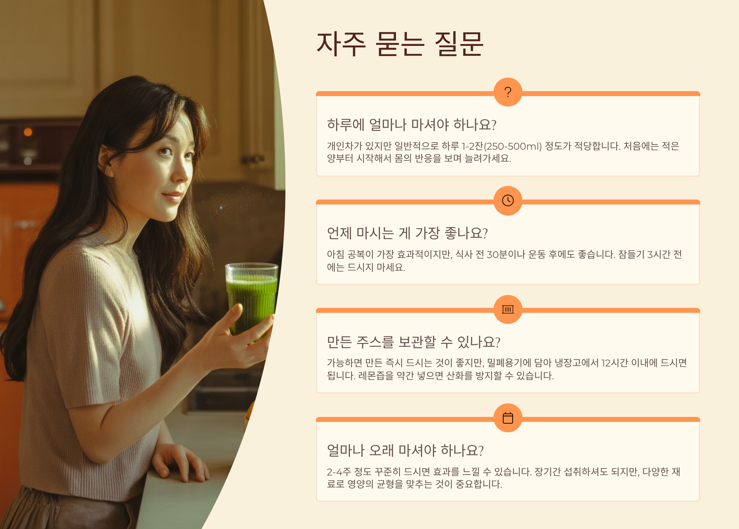 - 섭취 시간: 아침 공복에 마시면 몸이 영양소를 더 잘 흡수할 수 있어 효과적입니다. 하루 1~2잔을 꾸준히 마시는 것을 권장합니다.