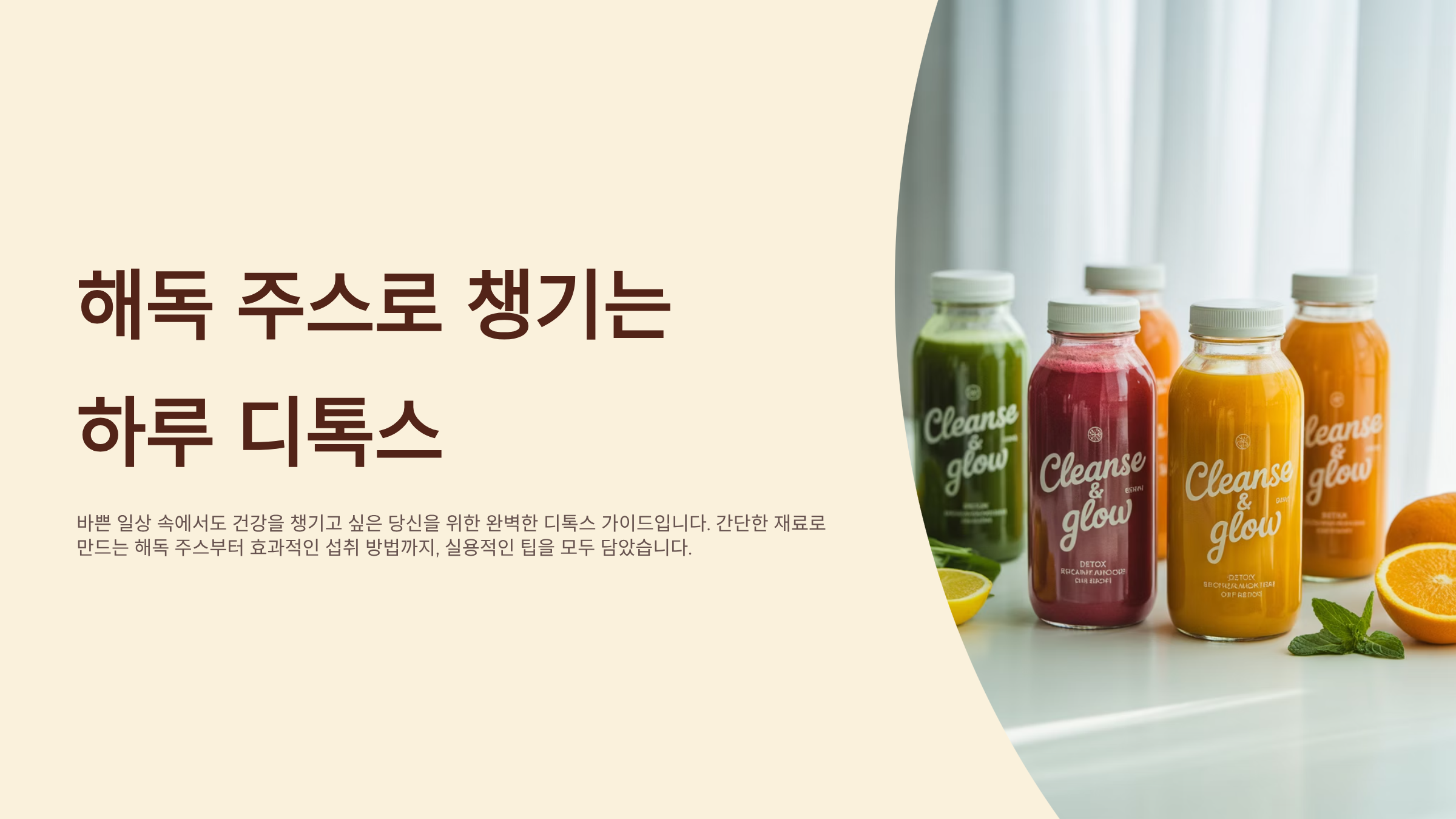 이 글은 일반적인 건강 정보 제공을 목적으로 작성되었으며, 특정 질병의 진단이나 치료를 위한 전문적인 의료 조언이 될 수 없습니다. 개인의 건강 상태나 기저 질환에 따라 해독 주스 섭취가 부적절할 수 있으므로, 섭취 전 반드시 전문가와 상담하시기 바랍니다. 본 정보로 인한 직간접적 손해에 대해 책임지지 않습니다.