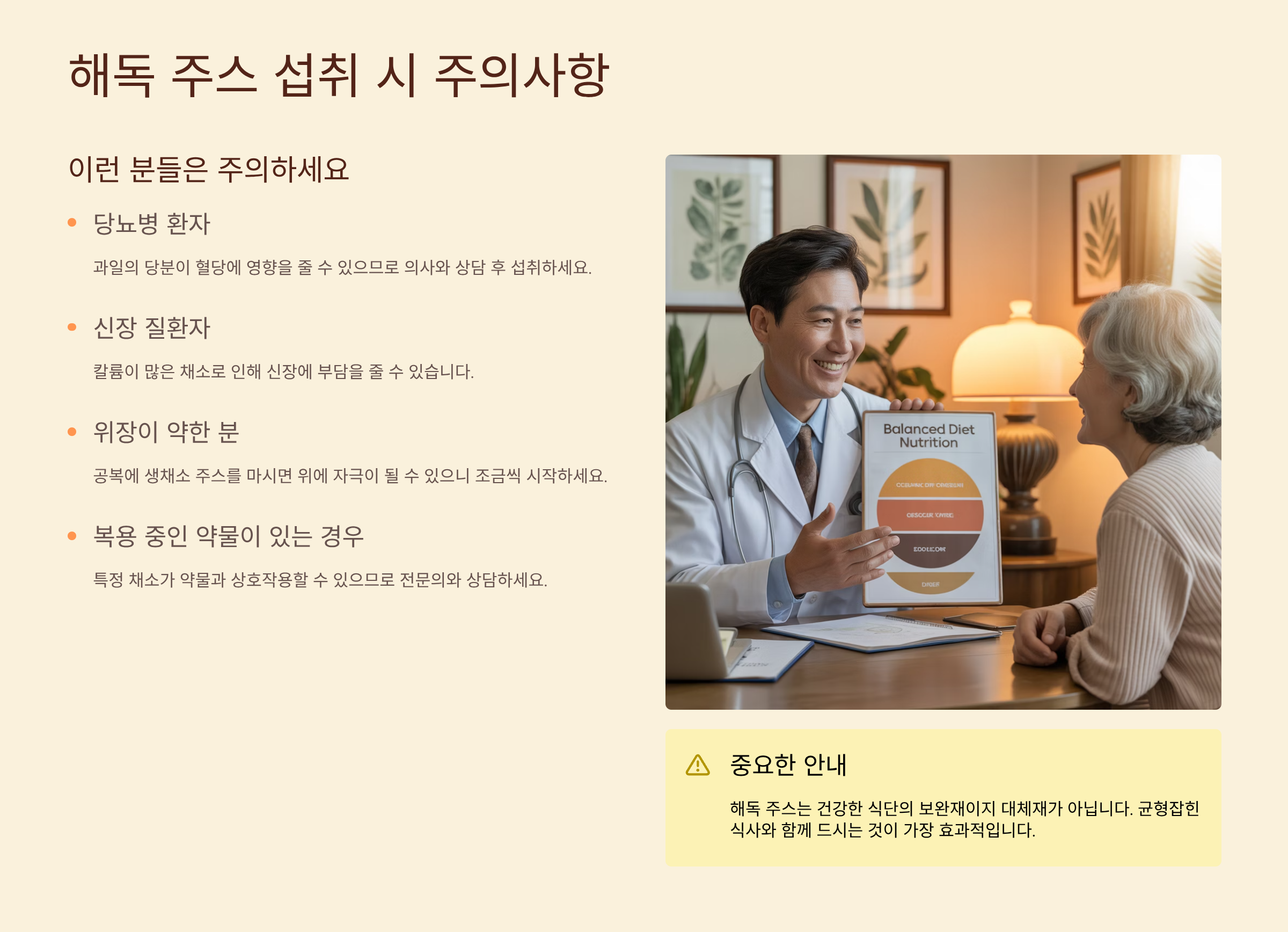 해독 주스는 건강에 이롭지만, 모든 사람에게 좋은 것은 아닙니다. 자신의 건강 상태를 고려하여 섭취하는 것이 중요해요.