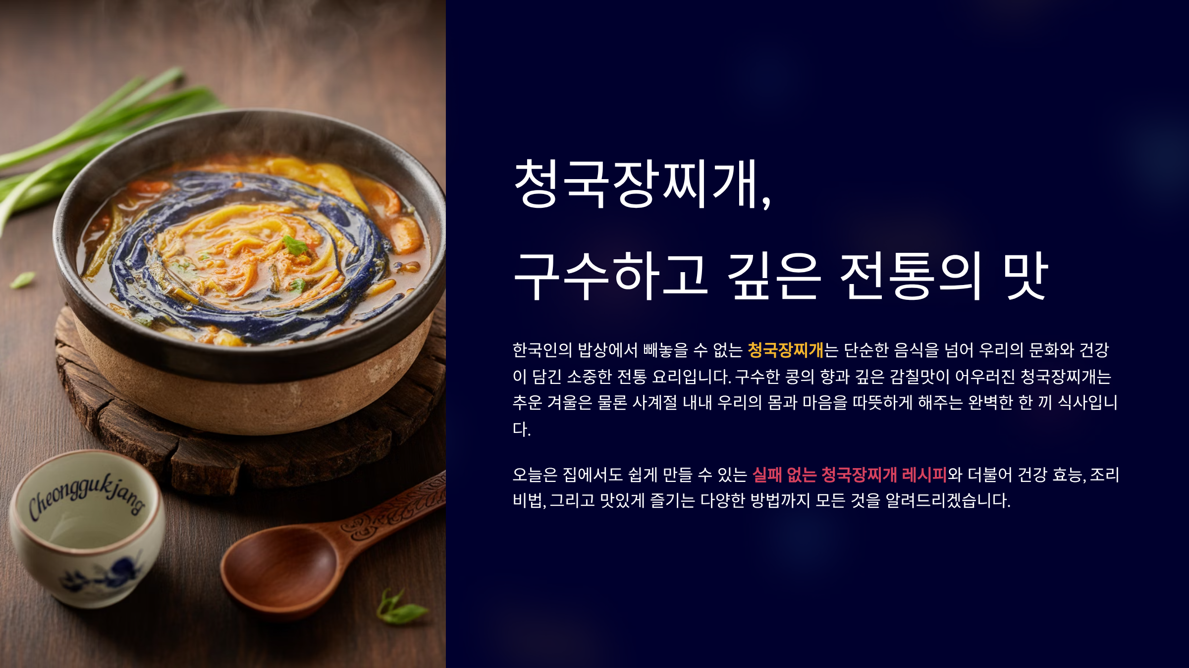 따뜻한 밥 위에 쓱싹 비벼 먹으면 잃었던 입맛도 되살아나는 마법 같은 음식, 바로 청국장찌개입니다. 특유의 구수한 향과 쿰쿰한 맛은 우리 몸과 마음을 따뜻하게 위로해주는 듯한 느낌을 줍니다. 하지만 집에서 끓이려면 냄새 때문에 망설이는 분들도 적지 않죠. 하지만 청국장찌개는 몇 가지 재료와 비법만 알면 누구나 쉽게 구수하고 깊은 맛을 낼 수 있습니다. 이 글에서는 청국장찌개를 더욱 맛있게 만드는 황금 레시피는 물론, 청국장의 놀라운 효능과 다양한 재료 활용법까지 꼼꼼하게 정리했습니다. 쌀쌀해진 날씨에 따뜻한 청국장찌개 한 그릇으로 가족의 건강과 행복을 챙겨보세요. 가장 신선한 재료를 고르는 법부터, 찌개의 맛을 좌우하는 육수 비법, 그리고 청국장을 끓이는 순서까지, 모든 노하우를 담았으니 이 글만 따라 하시면 실패 없이 완벽한 청국장찌개를 완성할 수 있을 것입니다.