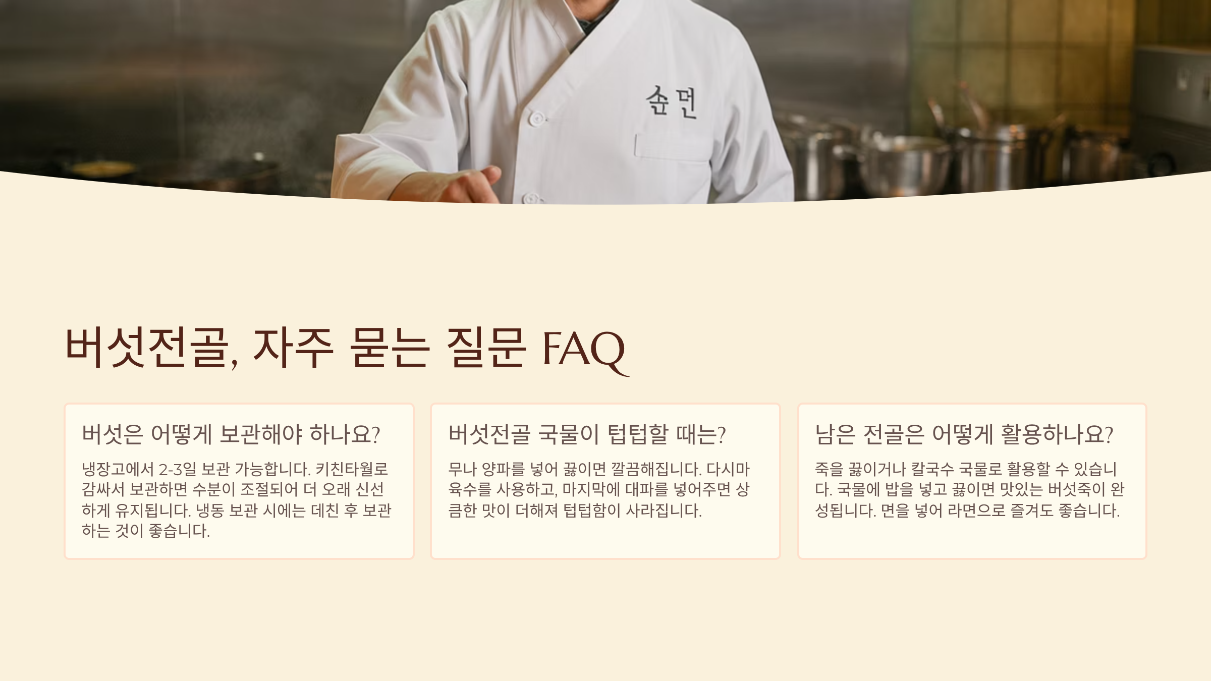 버섯전골에 대해 자주 궁금해하는 질문들을 모아 답변해 드립니다.