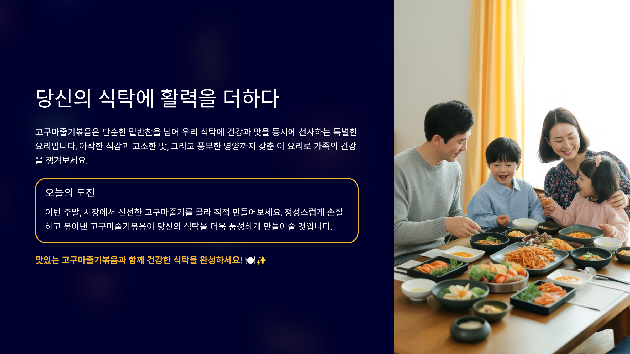 고구마줄기볶음은 단순히 맛있는 반찬을 넘어, 제철 식재료를 활용하여 우리 몸에 활력을 불어넣는 훌륭한 요리입니다. 번거로운 손질 과정도 이제는 간단한 팁만으로 해결할 수 있습니다. 들깨를 넣어 고소하게, 고춧가루를 넣어 매콤하게, 당신의 취향에 맞게 자유롭게 변주해 보세요. 고구마줄기볶음 하나로 밥 한 공기가 부족해지는 놀라운 경험을 하게 될 것입니다. 이 글을 통해 얻은 정보를 바탕으로 오늘 저녁 식탁에 특별한 고구마줄기볶음을 올려보시는 건 어떨까요? 분명 온 가족이 만족하는 든든한 한 끼가 될 것입니다.